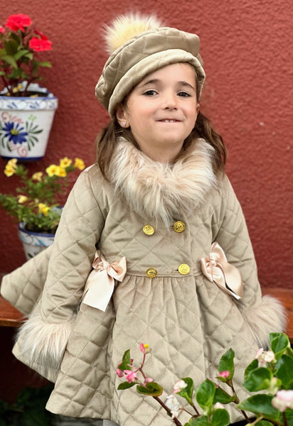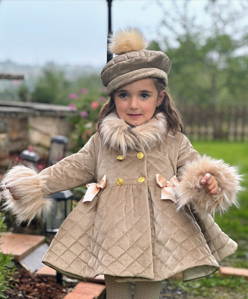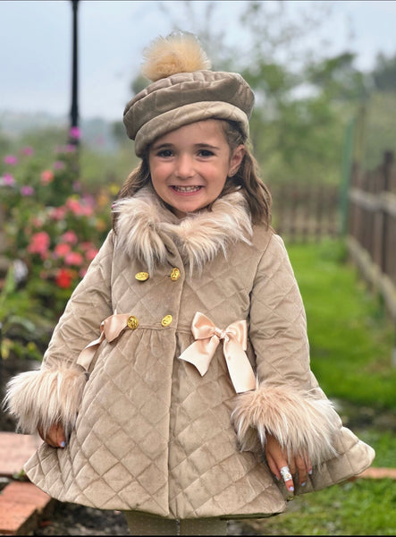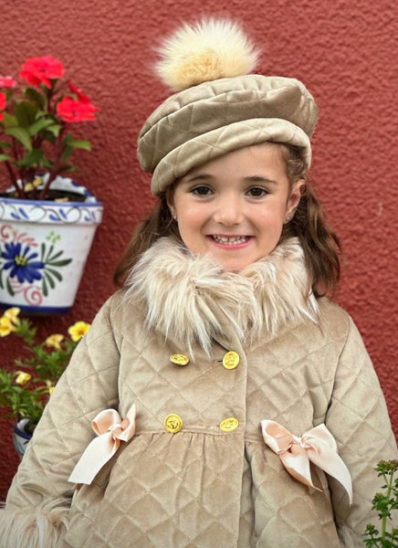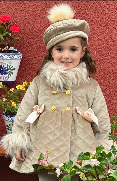 Sonata Infantil luxury Spanish girls camel/Pink velvet coat with bows, fur trim and gold button fastening True to size fitting. The beret is not included, but is available to order seperately. This item is made to order and takes approximately 8 weeks to arrive from the order date (if you need the item sooner please message us to discuss this)