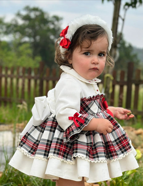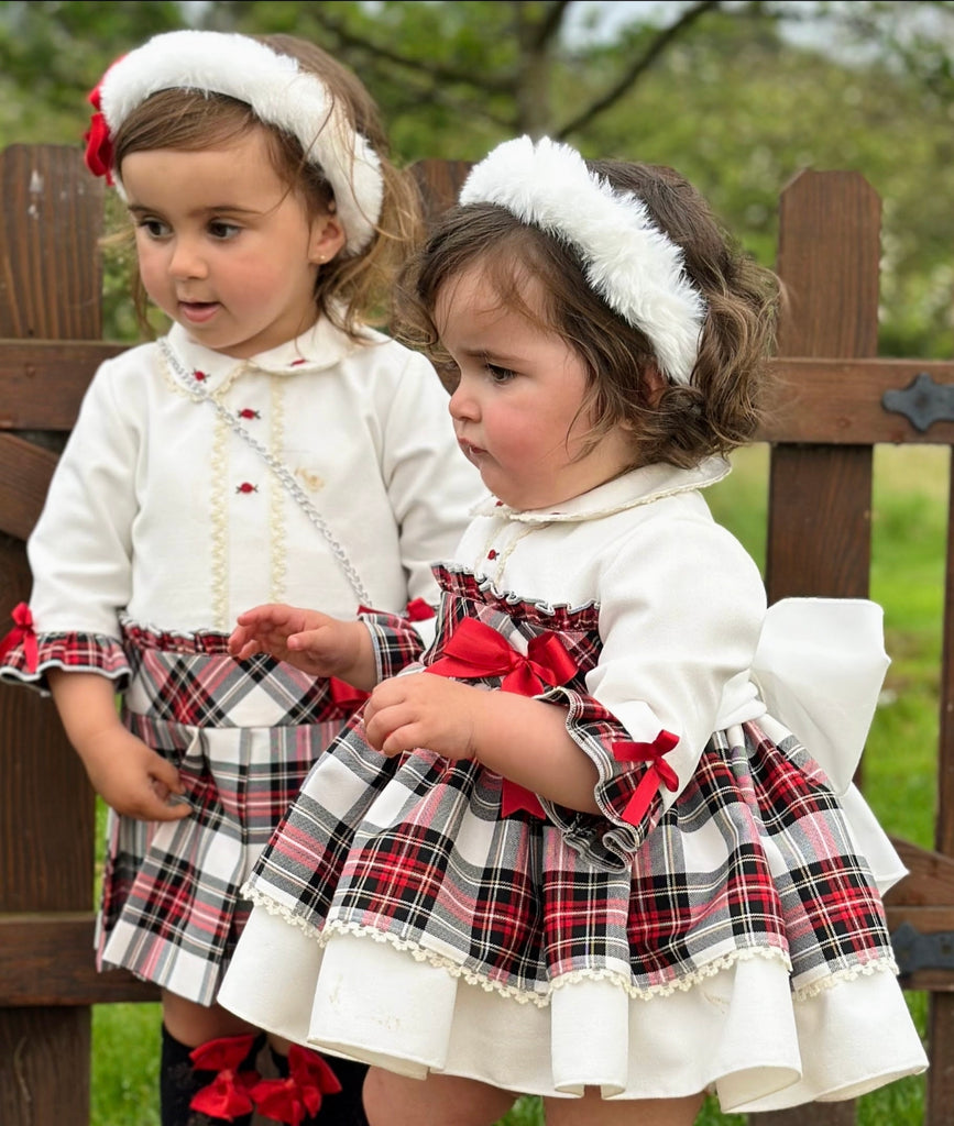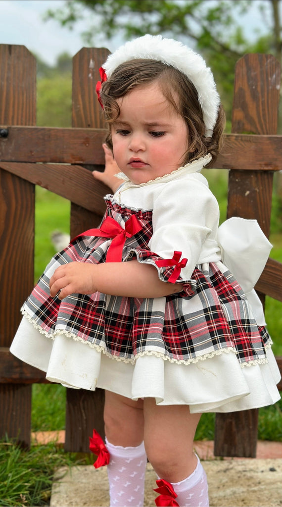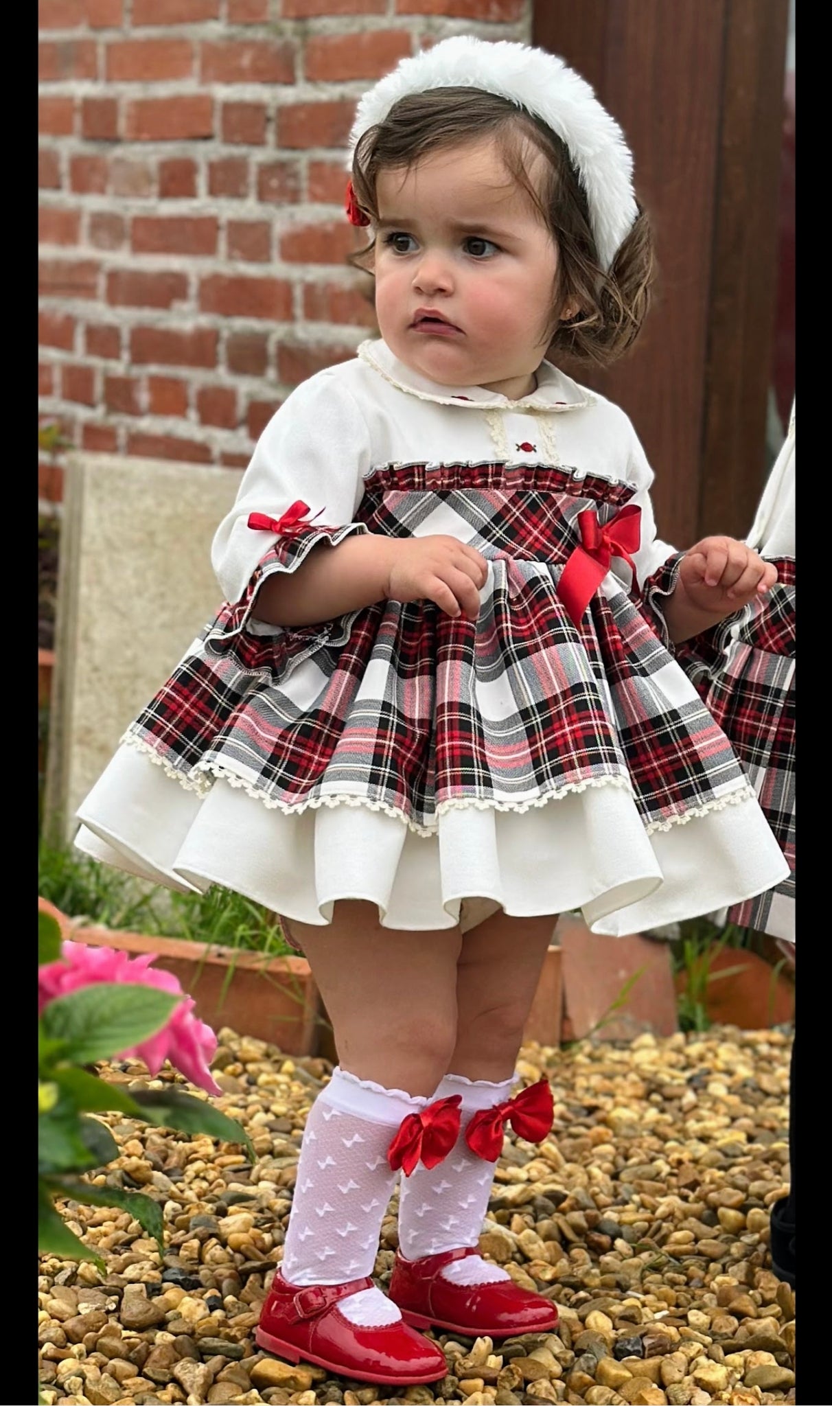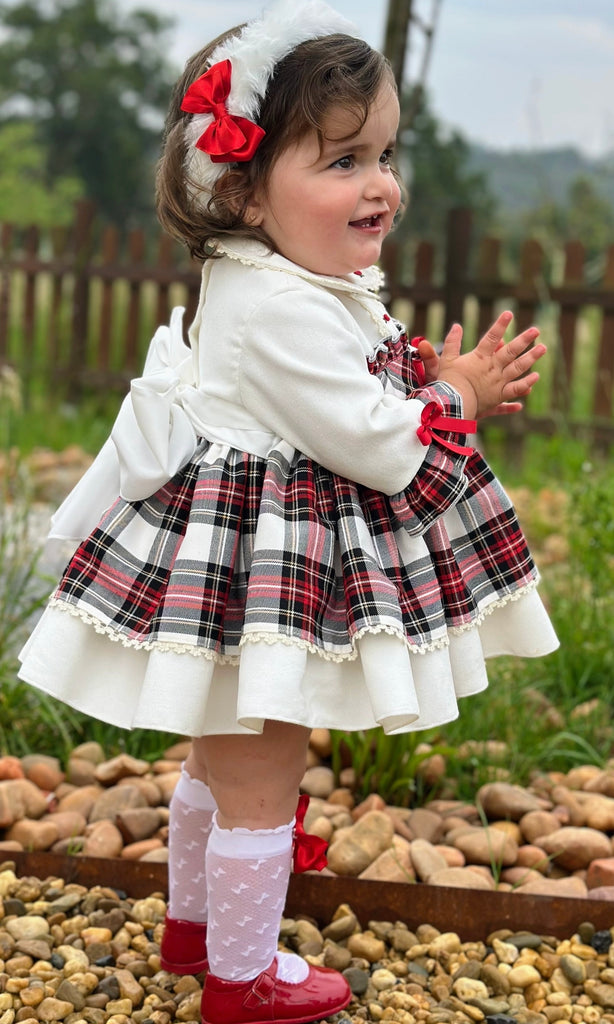 Sonata Infantil AW25 Spanish Girls Ivory Velvet & Red Plaid Christmas Puffball Dress IN2503 ~ MADE TO ORDER