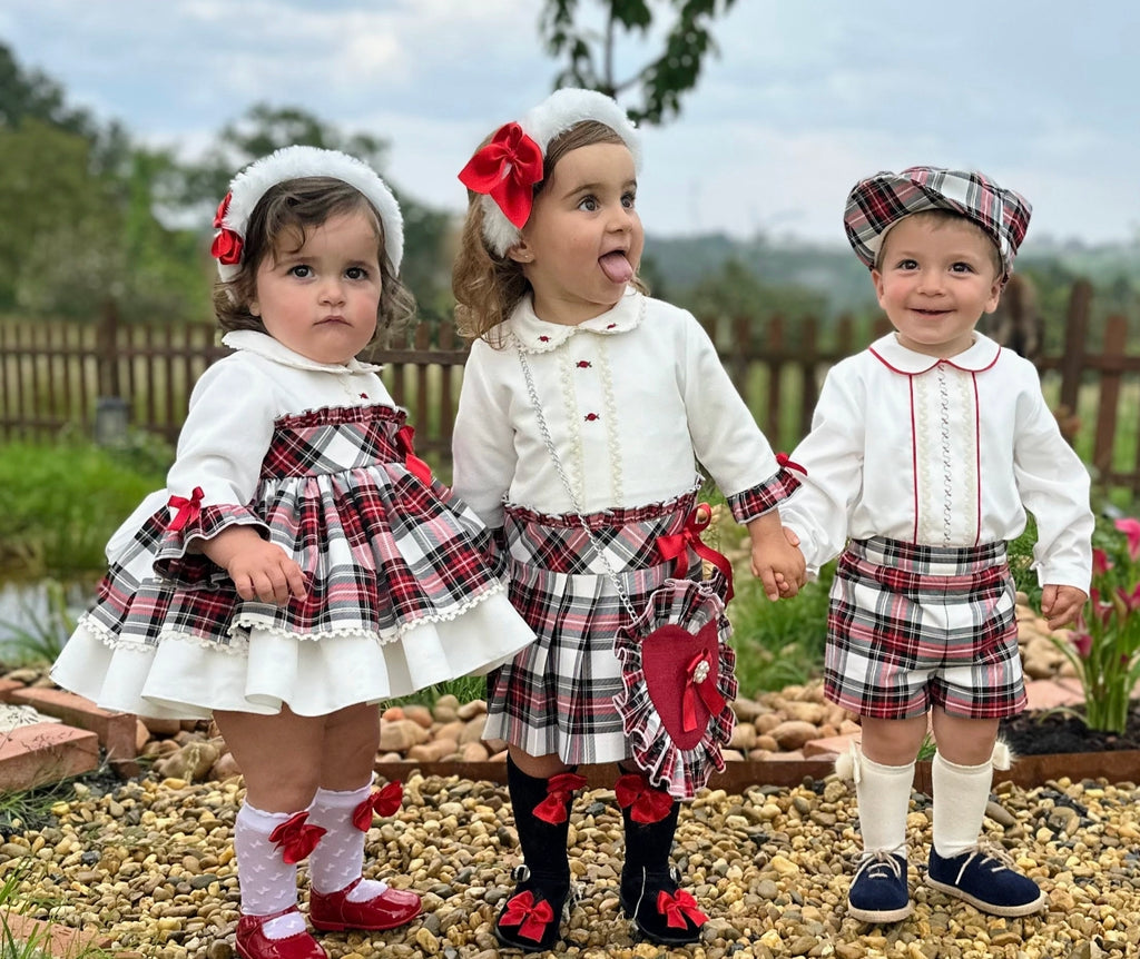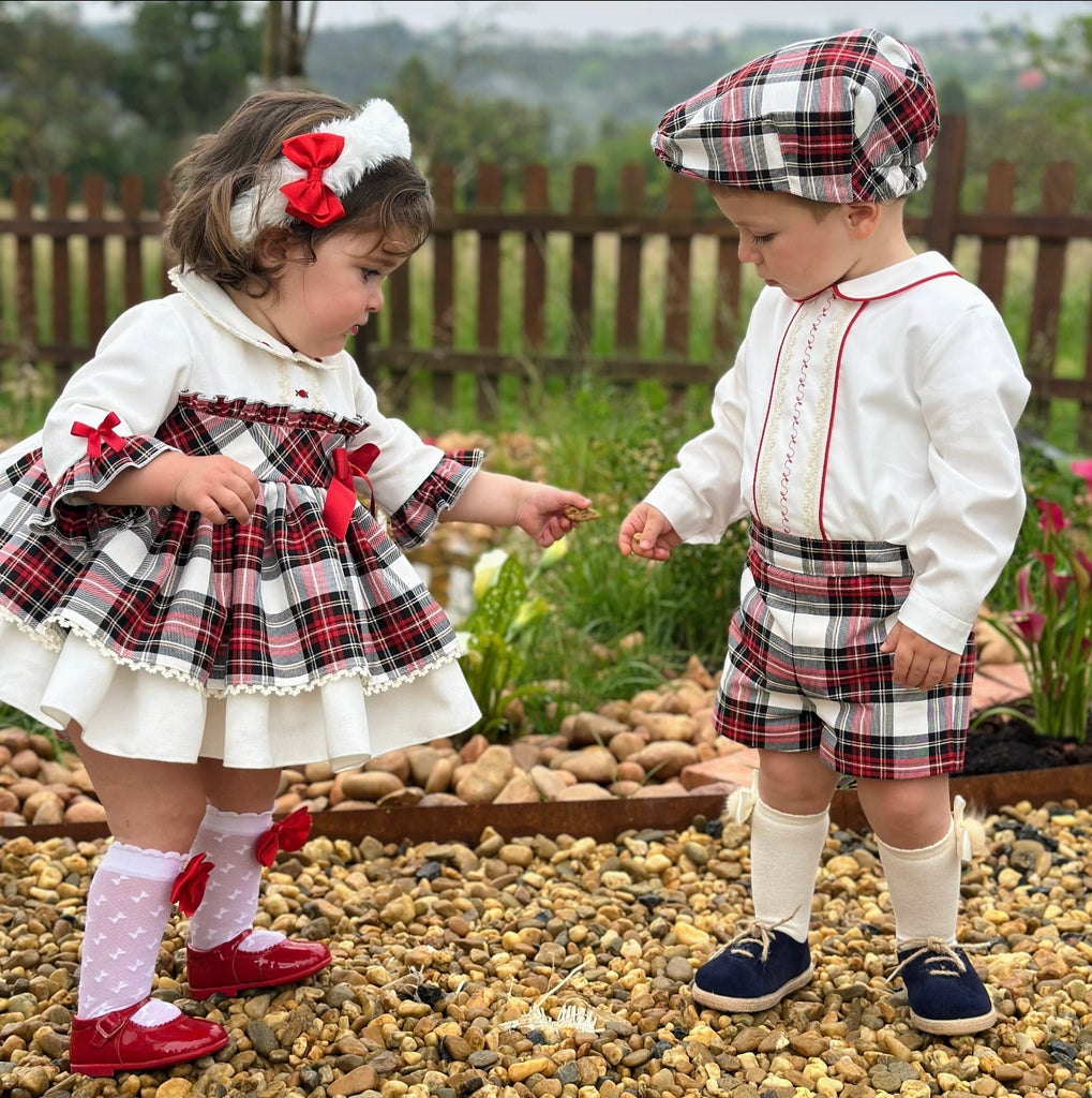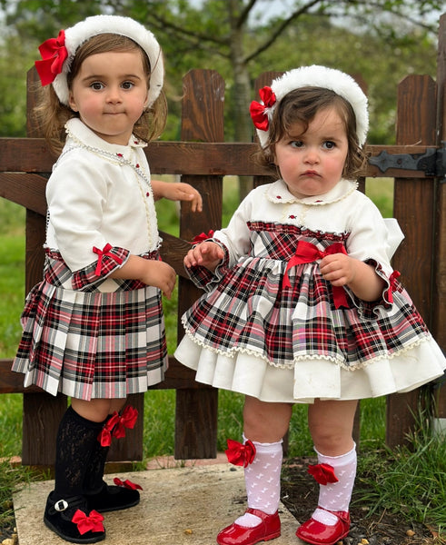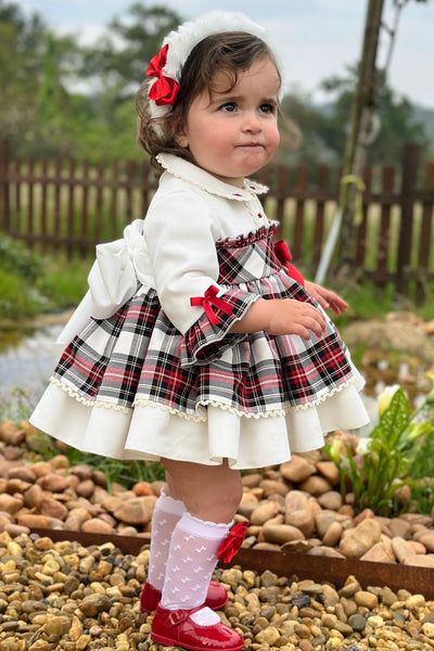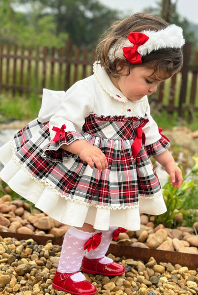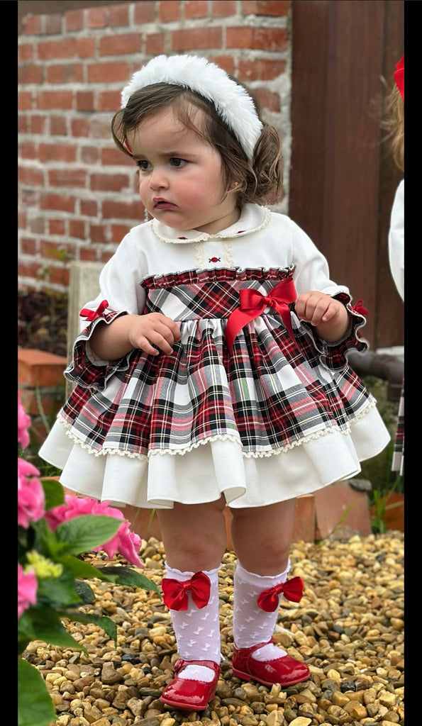 Sonata Infantil AW25 Spanish Girls Ivory Velvet & Red Plaid Christmas Puffball Dress IN2503 ~ MADE TO ORDER