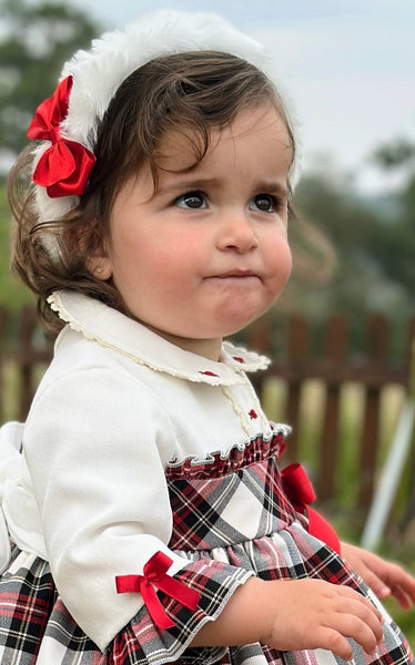 Sonata Infantil AW25 Spanish Girls Ivory velvet & Red plaid Christmas Puffball Dress. True to size fitting. The matching headband, socks and shoes are available separately. Order by the 5th November for guaranteed xmas delivery! This item is made to order and takes approximately 8 weeks to arrive from the order date. Kindly note items which are ' made to order' are exempt from a return as they are ordered in by customer request. If you need measurements, please message us before ordering.