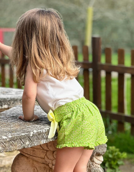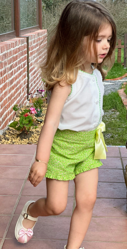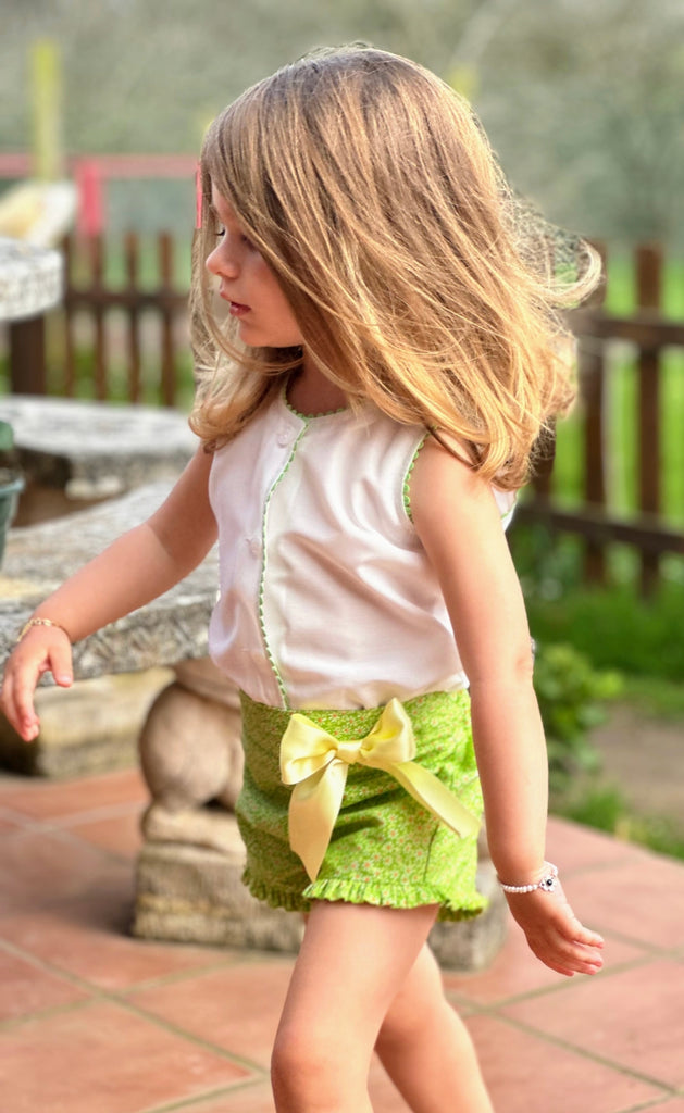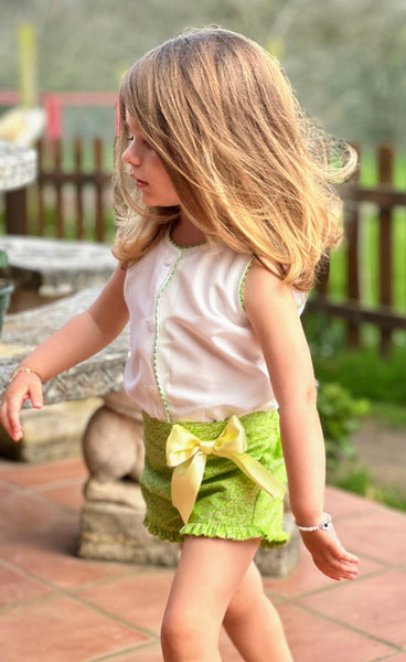 Sonata Infantil Spanish girls green shorts and blouse set. True to size fitting. This item is made to order and takes approximately 8 weeks to arrive from the order date. Kindly note items which are ' made to order' are exempt from a return as they are ordered in by customer request. If you need measurements, please message us before ordering.