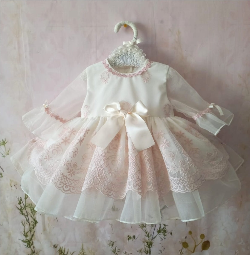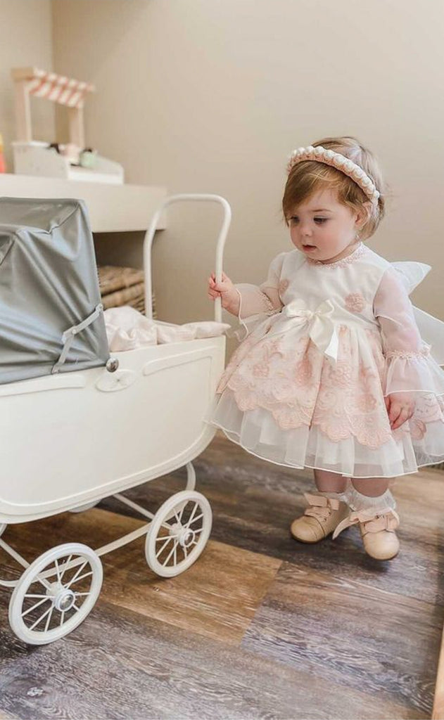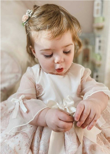 Sonata Infantil Spanish girls pink organza and lace puffball dress, with satin bows. True to size fitting. Perfect for weddings, christenings and any other special occasion. These items are made to order and take approximately 8 weeks to arrive from the order date. Kindly note items which are 'made to order' are exempt from a return as they are ordered in by customer request. If you need measurements, please contact us before ordering.