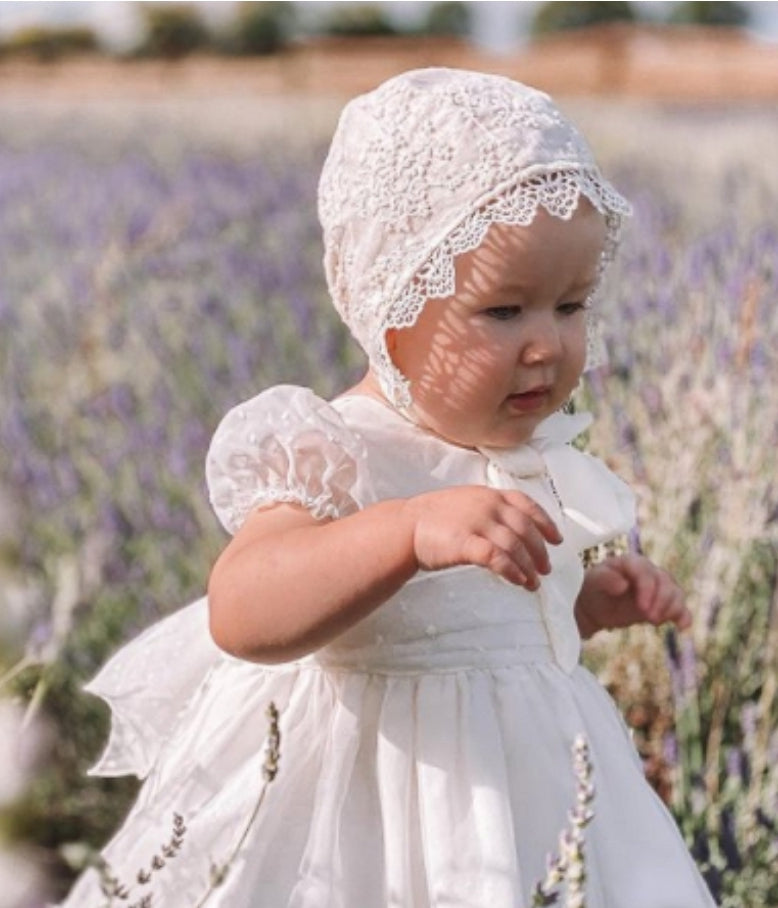 Sonata Infantil Spanish girls white lace special occasion puffball dress. True to size fitting. Matching bonnet is available to order here. Available to order as just the dress or just the pants, please use the dropdown menu to select which product you want to order. If you want both the dress and pants please add both to your basket. These dresses are made to order and take approximately 6-8 weeks to arrive from the order date. Kindly note items which are 'Made to order' are exempt from a return, as they are ordered in by customer request. If you need measurements, please contact us before ordering.