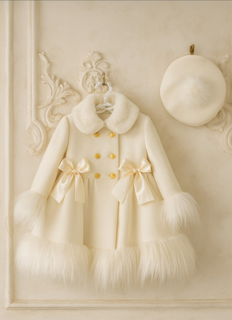 Sonata Infantil luxury Spanish girls cream coat with bows, fir trim and gold button fastening True to size fitting. The beret is not included, but is available to order seperately. Order by the 5th November for guaranteed xmas delivery! This item is made to order and takes approximately 8 weeks to arrive from the order date (if you need the item sooner please message us to discuss this)