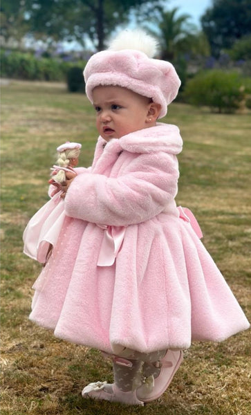 Sonata Infantil Spanish girls pink extra soft fur coat with pearl design buttons and bows. In stock ready for immediate shipping. Beret is not included, coat only. True to size fitting.