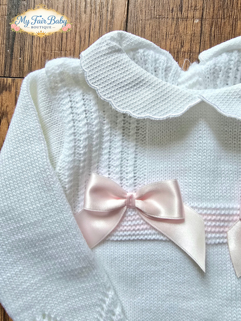 Spanish Baby Girls white & pink knitted jumper with a scalloped edge pique collar, front chest bows and a pretty open stitch design to the hem and cuffs. It features full back button fastening. Complete with matching trousers and bonnet. To fit age 0-3 months.