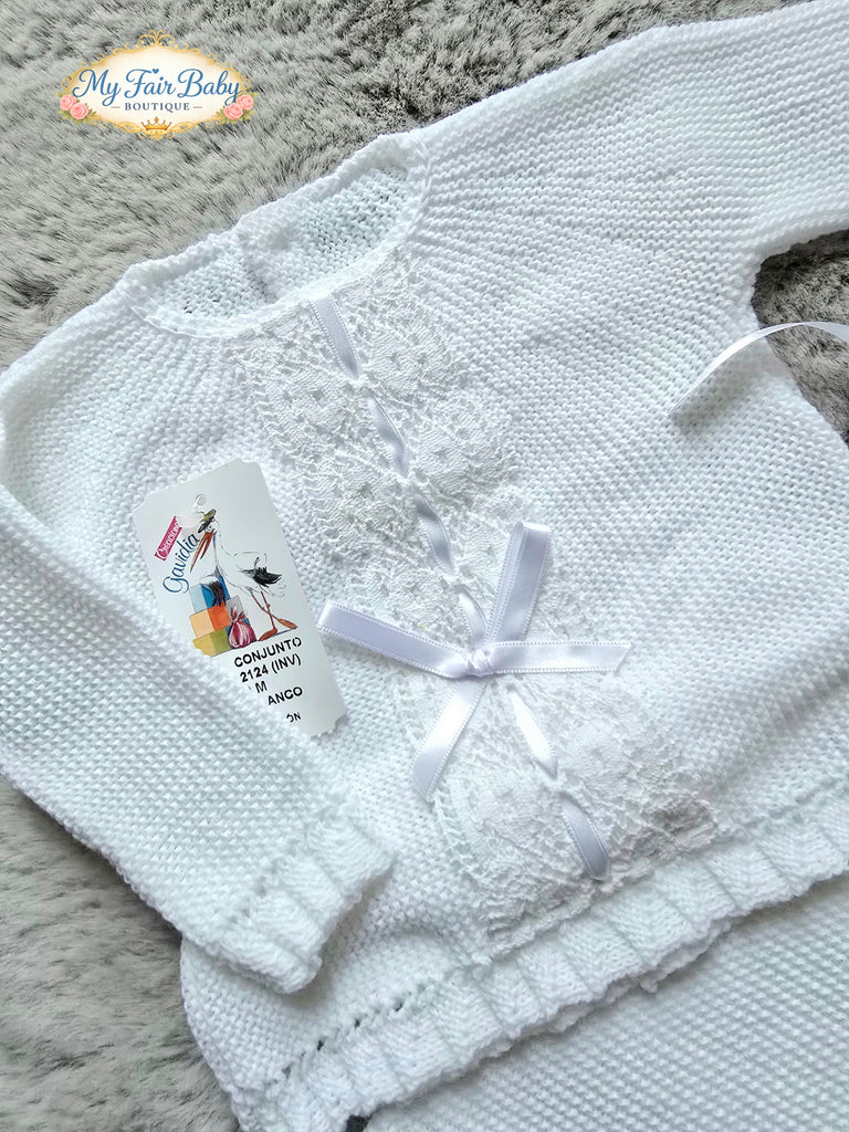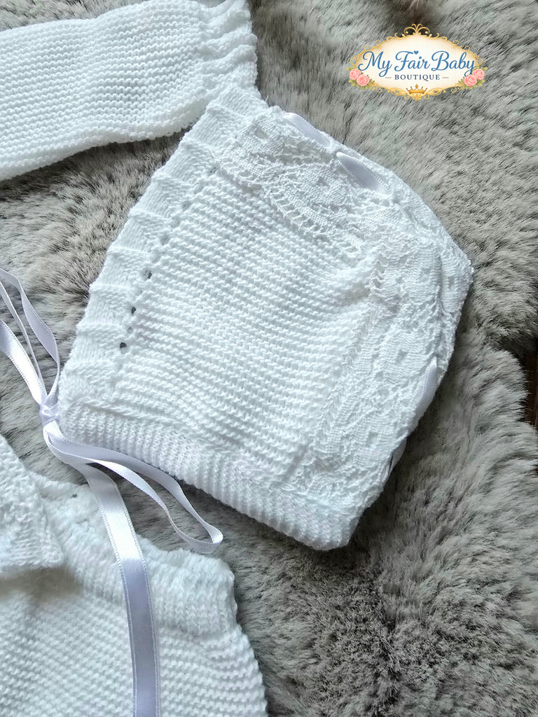Spanish Creaciones Gavidia white unisex knitted baby 3 piece set. Comprising of a beautiful knitted jumper with lace detailing. Matched with a pair of knitted trousers and coordinating bonnet.
