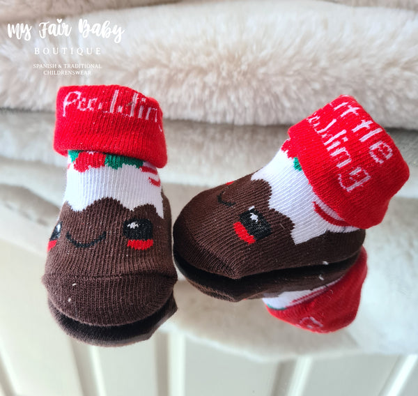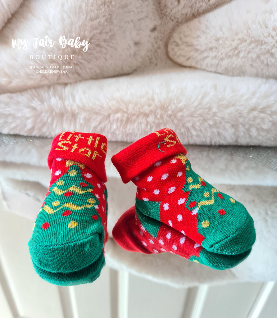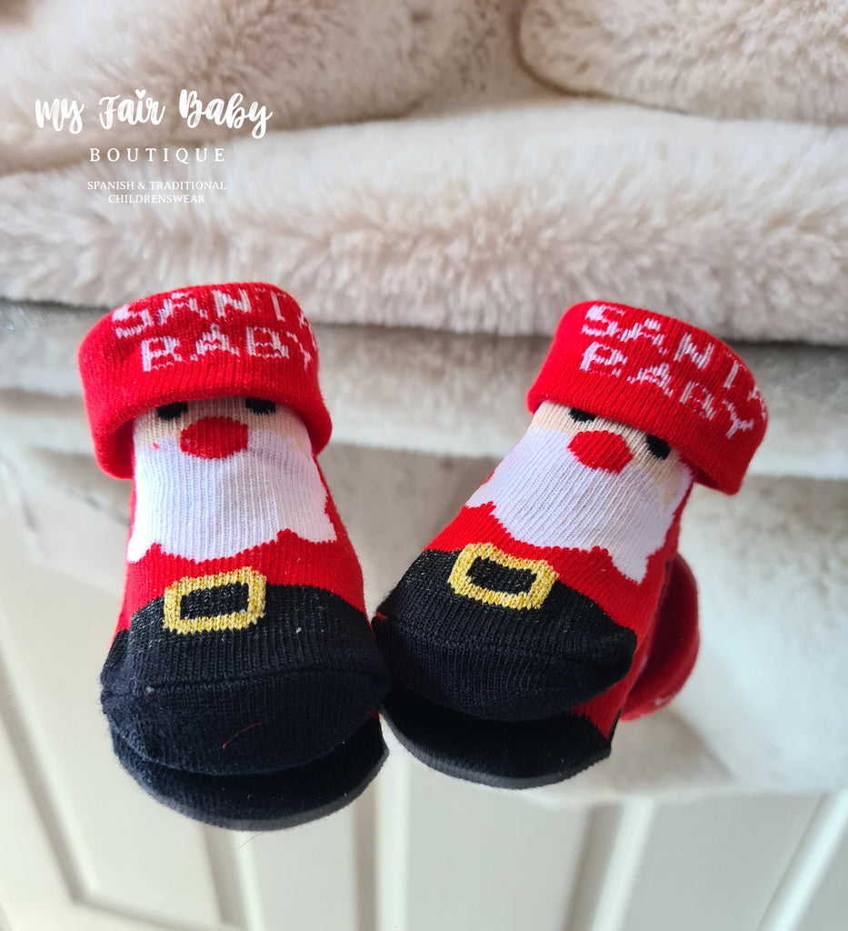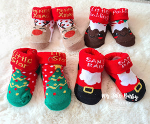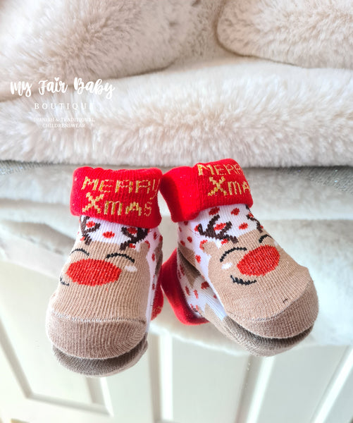 Baby Christmas socks. They come in a pretty red organza gift bag. Suitable for babies 0-6 months.