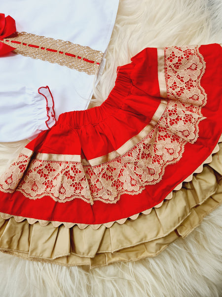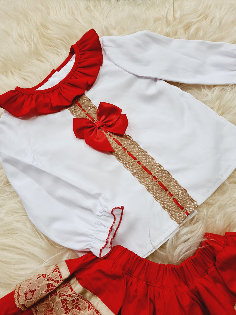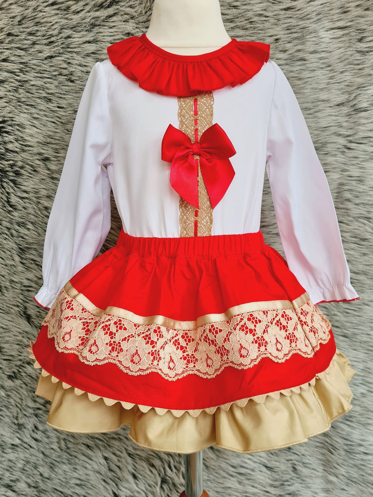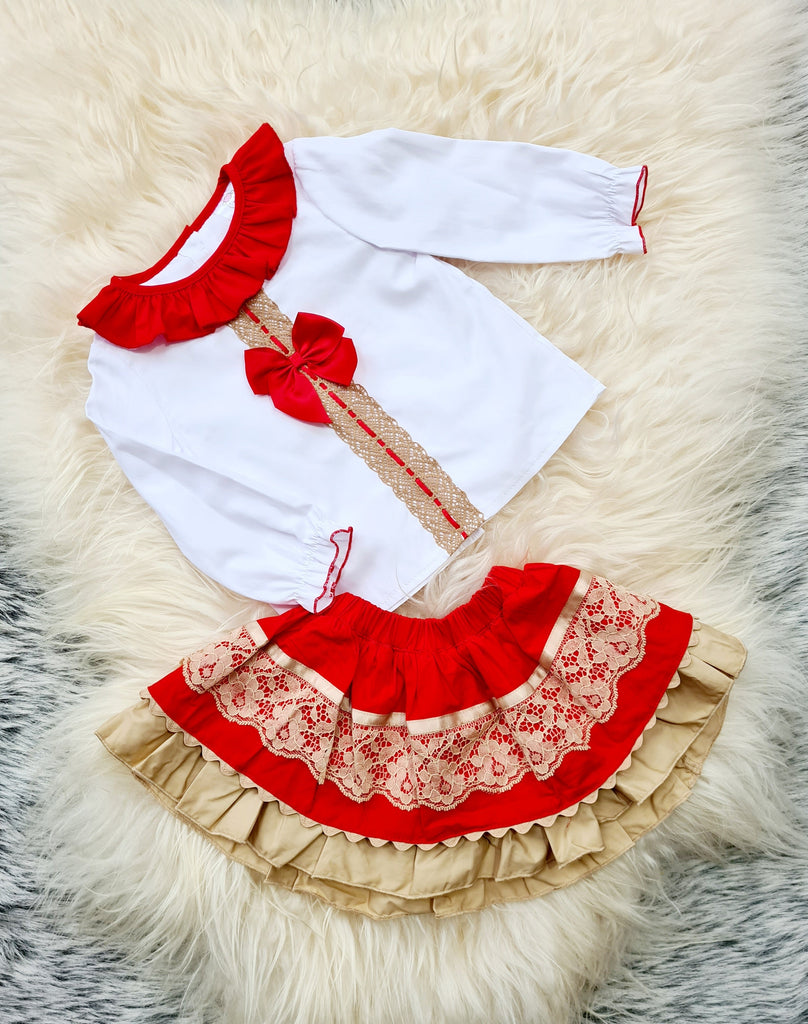 Spanish style girls white blouse with red frilly collar, camel lace trim and red silk bow. Matched with a red and camel skirt with camel lace detailing by Wee Me. True to size fitting.