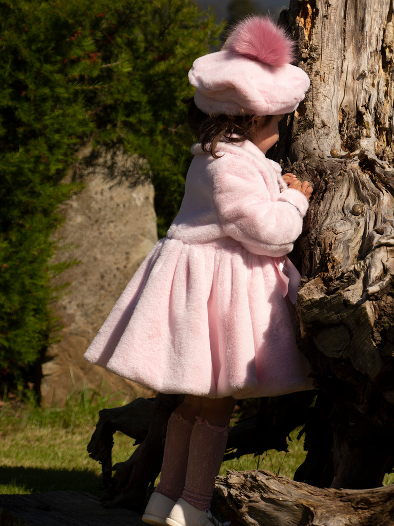 Sonata Infantil luxury Spanish girls pink fur coat. True to size fitting. The beret is not included but is available to order seperately. This item is made to order and takes approximately 8 weeks to arrive from the order date (if you need the item sooner please message us to discuss this)