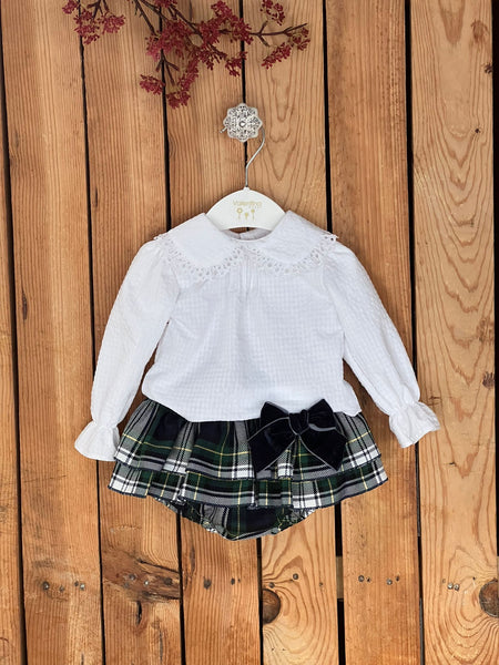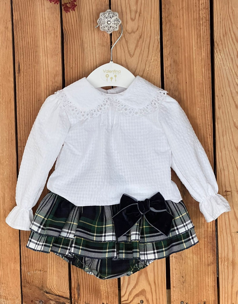 Valentina Bebes beautiful baby girls green tartan jam pant set. Features 100% cotton material. The skirted jam pants are fully lined and have a large navy velvet bow to the front. The matching white blouse has long sleeves, reverse button fastening and a lace trimmed hem. We also have a matching baby girls tartan dress which is available here.
