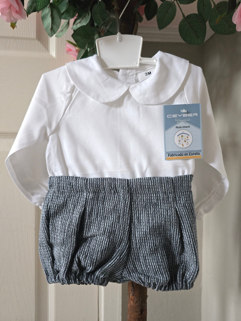 Ceyber Spanish baby boys grey woven jam pants, paired with a snart white shirt.