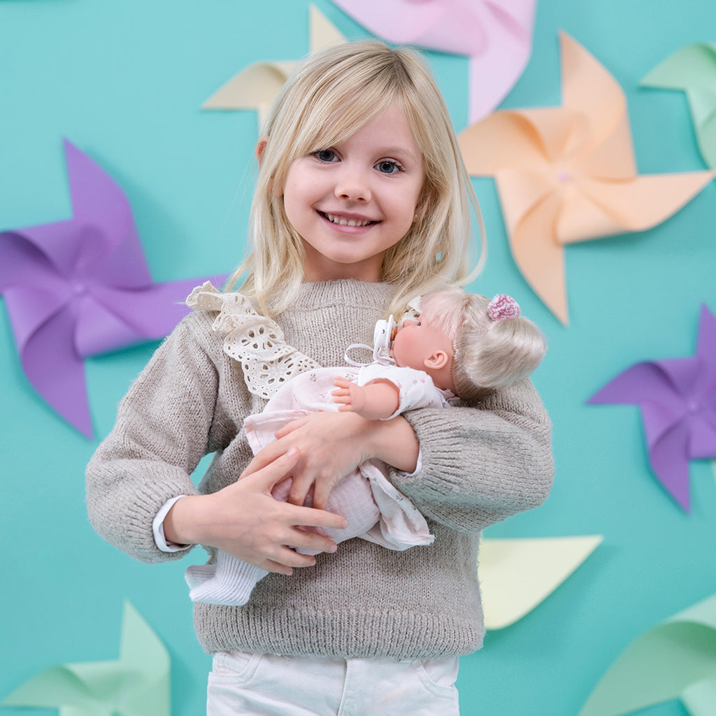 Roberta crying doll 33 cm is dressed in a pretty pink dress, bloomers and socks. Her blonde hair has been combed into two cute ponytails. Her round face, tiny ears, nose and mouth make the doll look like a real baby.