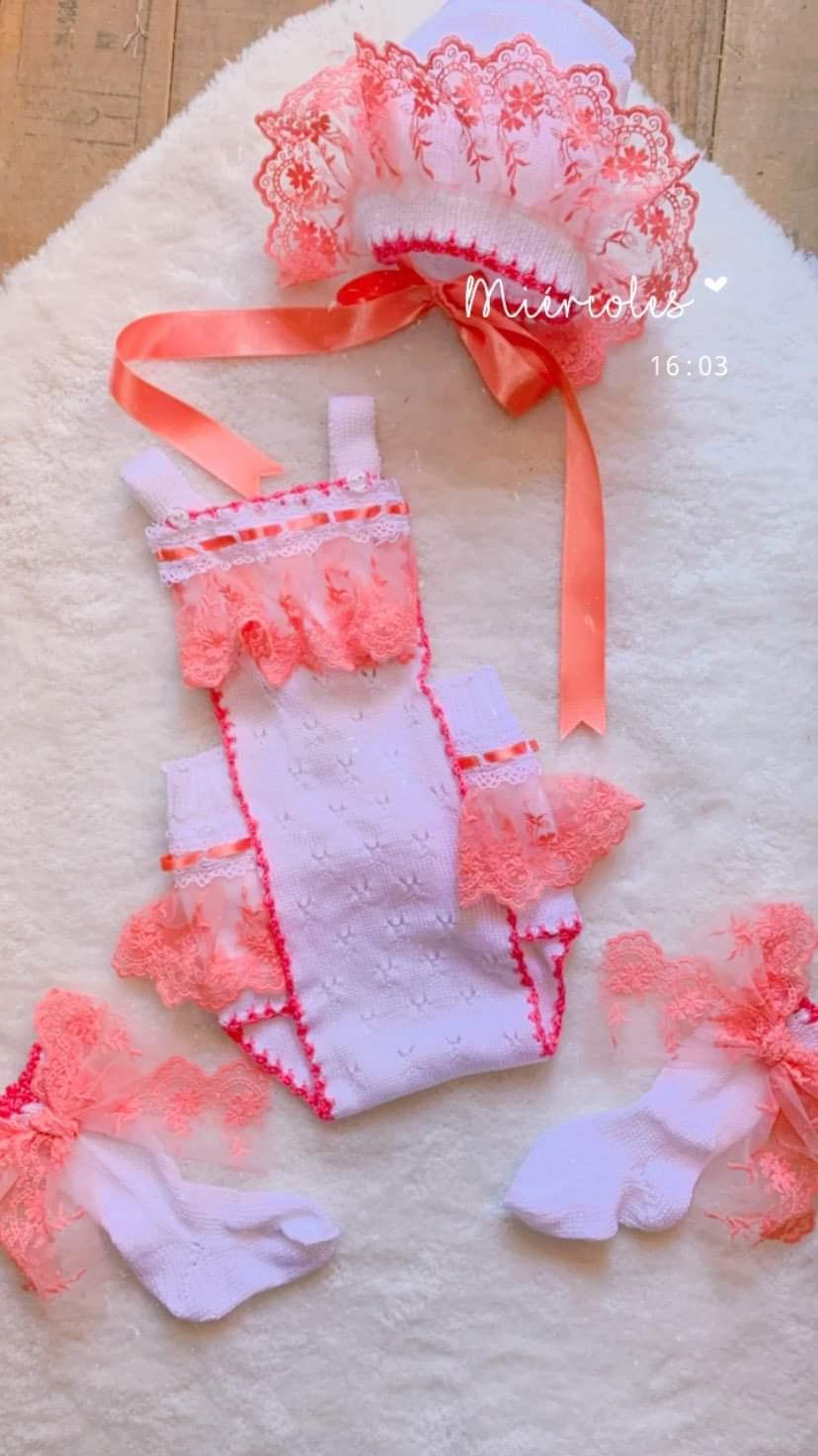 Ela Confeccion Spanish girls knitted romper with coral lace and bow detailing. Comes with bonnet included. Socks available seperately. These are small on sizing, we recommend ordering a size larger. These products are made to order and take approximately 6 weeks to arrive from the order date.