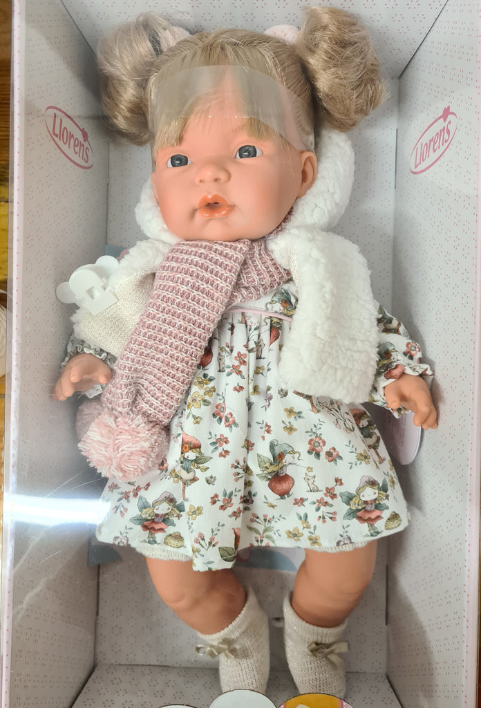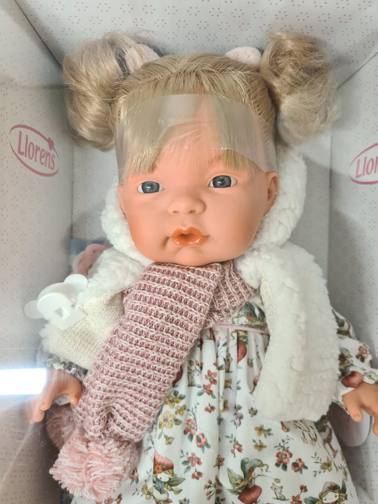 Joelle 38cm crying doll is dressed in a white dress, a pink scarf with pompoms, white socks and a fur vest. Her blonde hair has been combed into two cute ponytails. The round face, tiny ears, nose and mouth make the doll look like a real baby. Her favourite pacifier is very important to her, so when we take it from her, she will cry and call mum, bye bye.