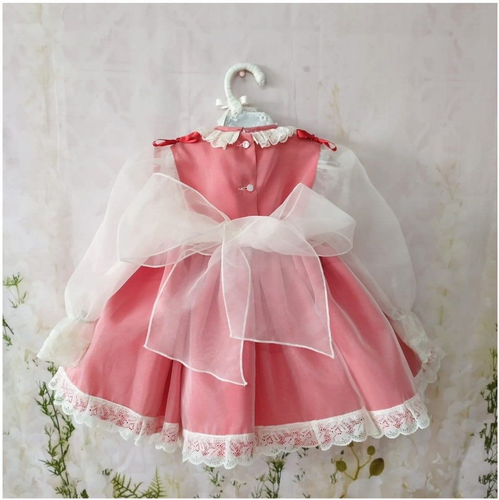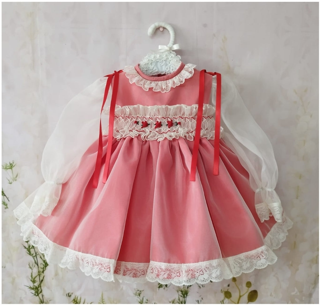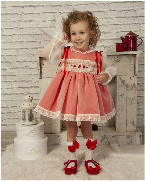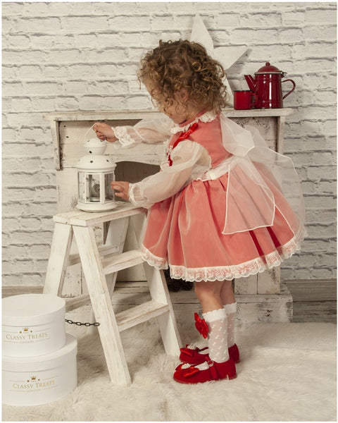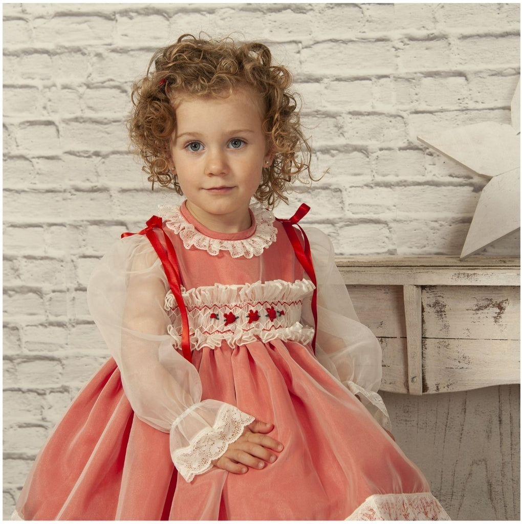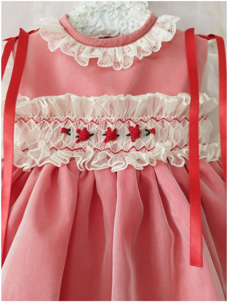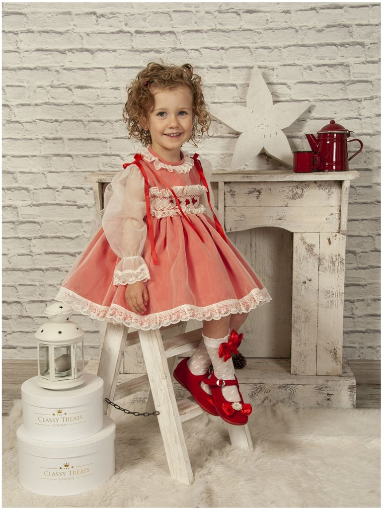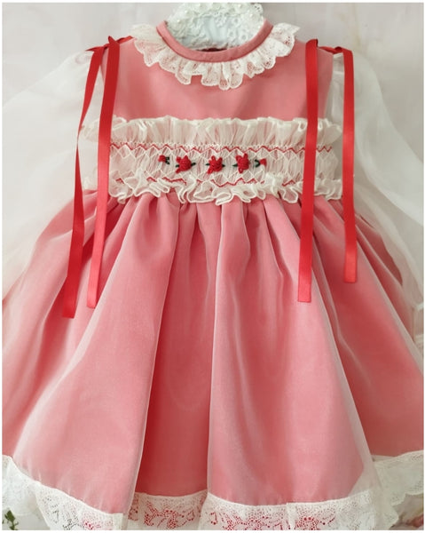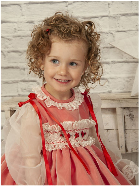 Sonata Infantil Spanish Girls red smocked organza puffball dress. Matching socks and bonnet are not included but available to purchase separately. Socks are here. Bonnet is here. This item is made to order and takes approximately 8 weeks to arrive from the order date.