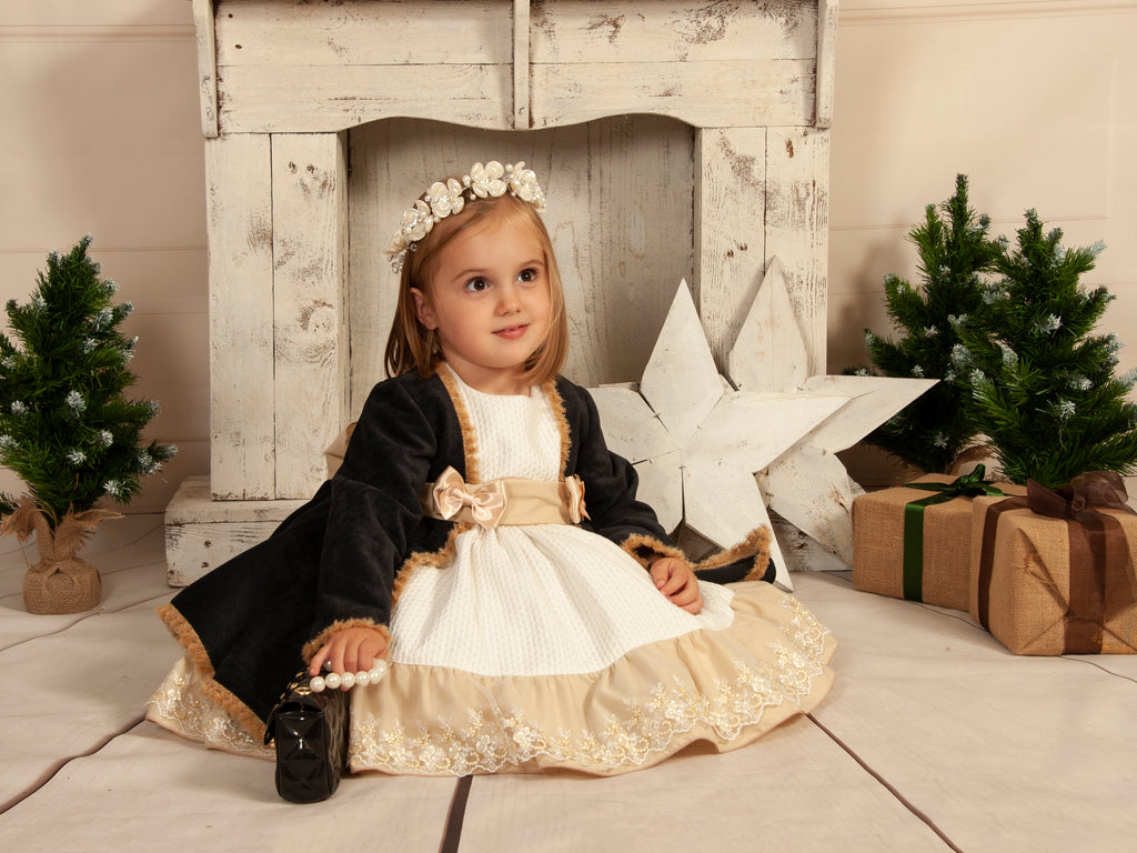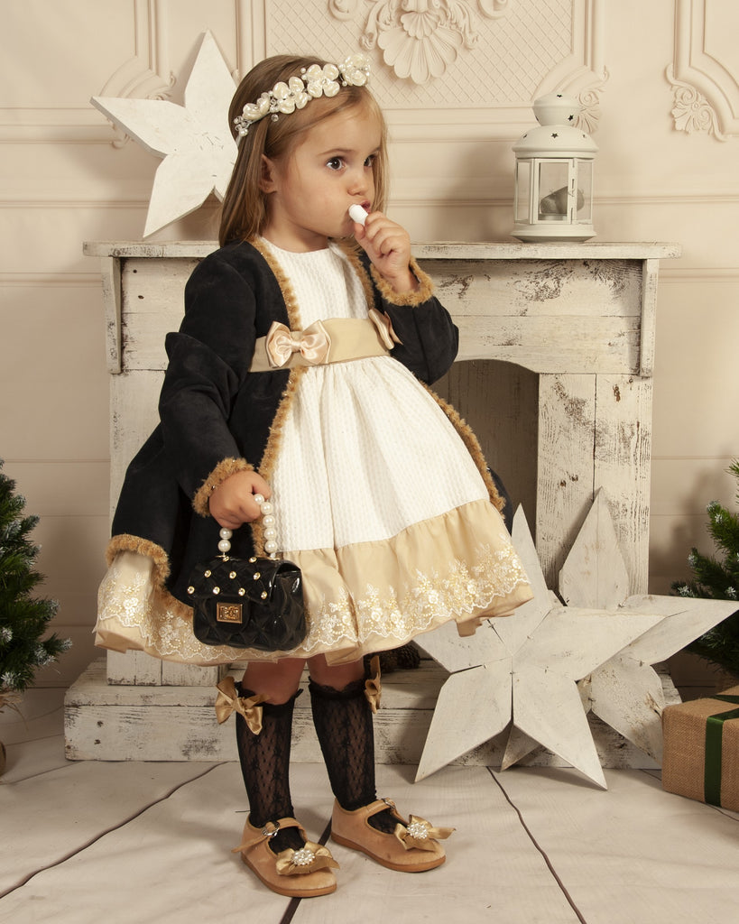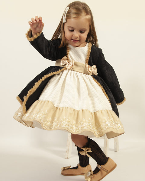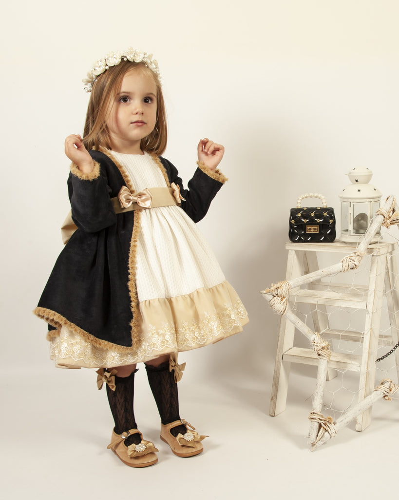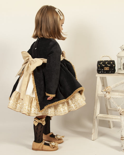 Sonata Infantil Spanish Girls navy velvet puffball dress. With camel fur trim and gold chest bows. This item is made to order and takes approximately 8 weeks to arrive from the order date. (if you need the item sooner please message us to discuss this)