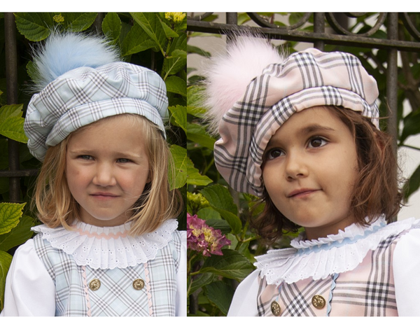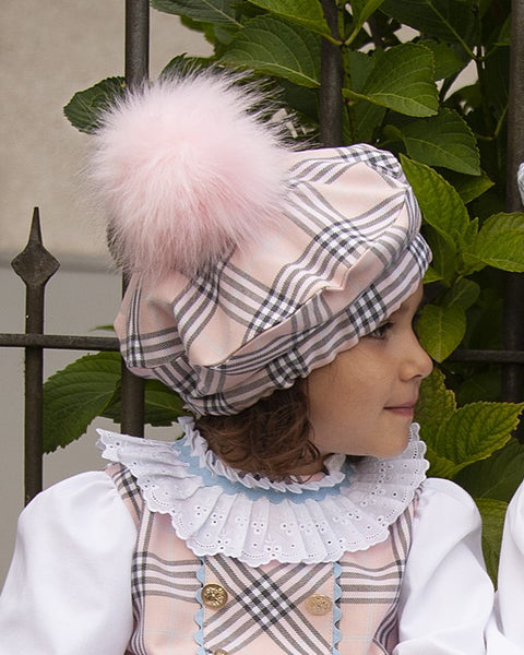 Spanish tartan beret with a fur pom pom by Sonata. Suitable for both boys and girls. Matching outfits are available to order seperately. Made to order and takes approximately 8 weeks to arrive from the order date.