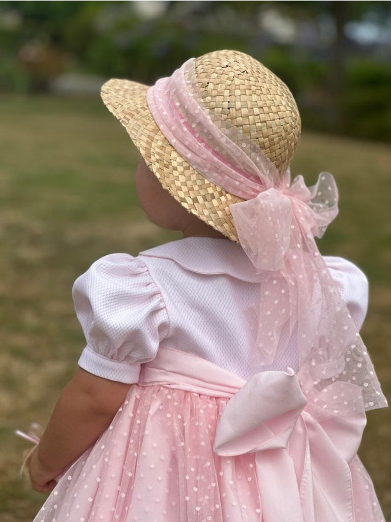 Beautiful Spanish girls pink dress with scalloped collar, capped sleeves, tulle overlace and bow detailing by Sonata infantil. This item is made to order and takes approximately 8 weeks to arrive from the order date (if you need the item sooner please message us to discuss this).