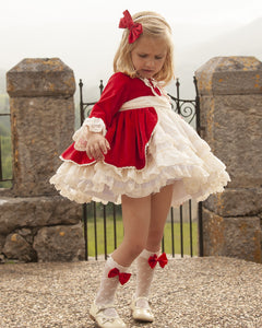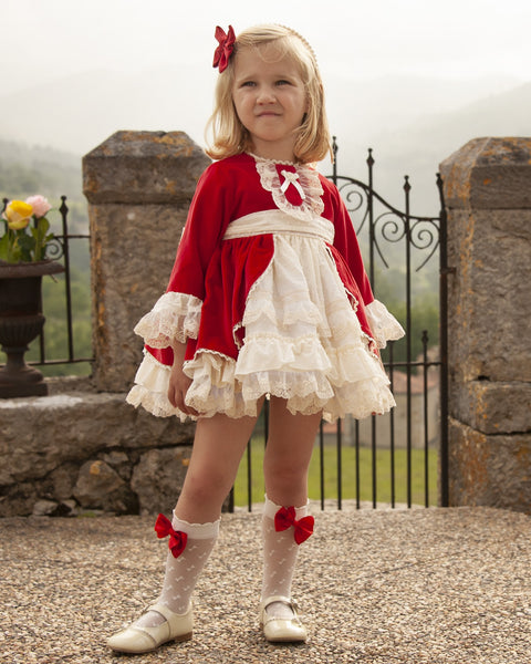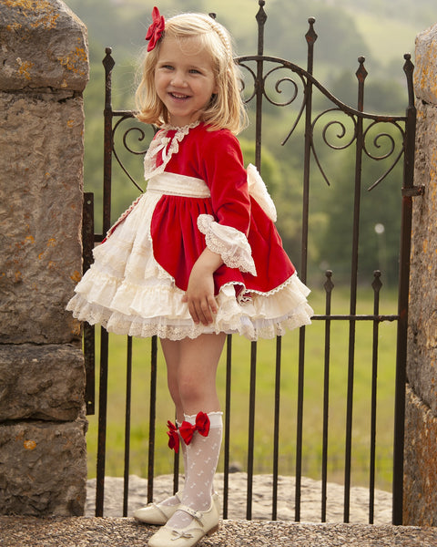 This item is made to order and takes approximately 8 weeks to arrive from the order date (if you need the item sooner please message us to discuss this). Beautiful Spanish girls red velvet puffball dress with cream ruffles and lace trim by Sonata Infantil. The red bow socks are available here.