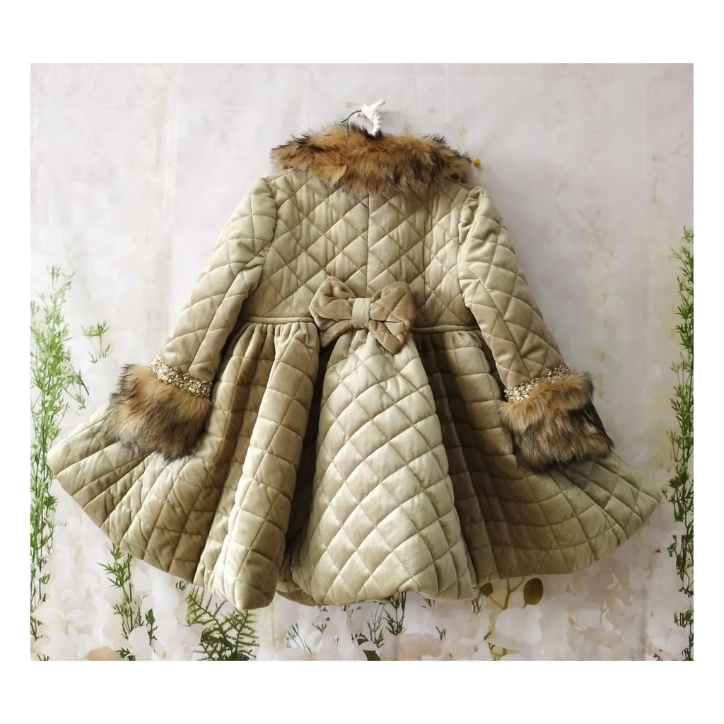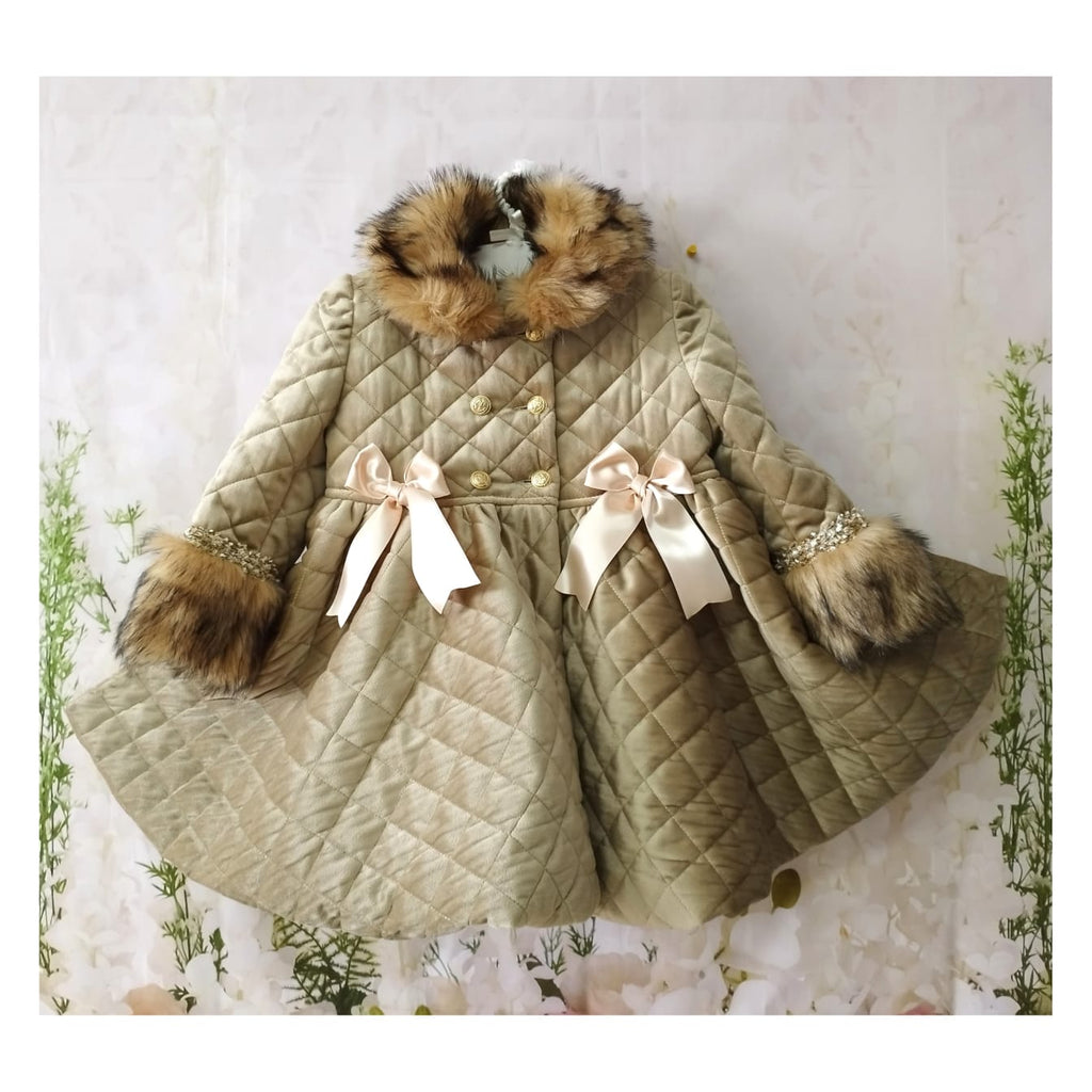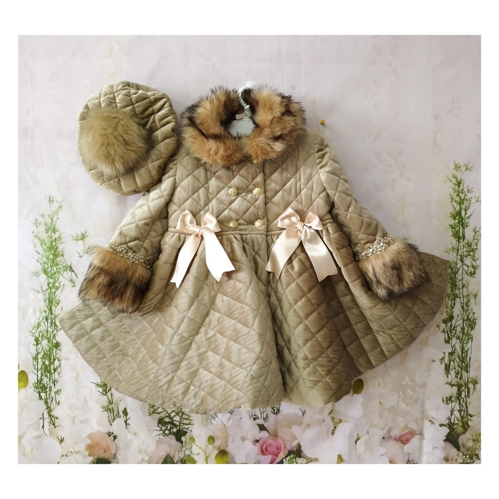 Sonata Infantil Spanish girls camel velvet winter coat with fur trim to the collar and cuffs. True to size fitting. Available to order with or without the matching beret. These items are made to order and take approximately 8 weeks to arrive from the order date. Payment plans and worldwide shipping are available. Kindly note items which are pre-ordered are exempt from a return as they are ordered in by customer request, if you need measurements before ordering, please send us a message via email or contact us on Facebook My Fair Baby Boutique - Home | Facebook or Instagram @my_fair_baby_boutique