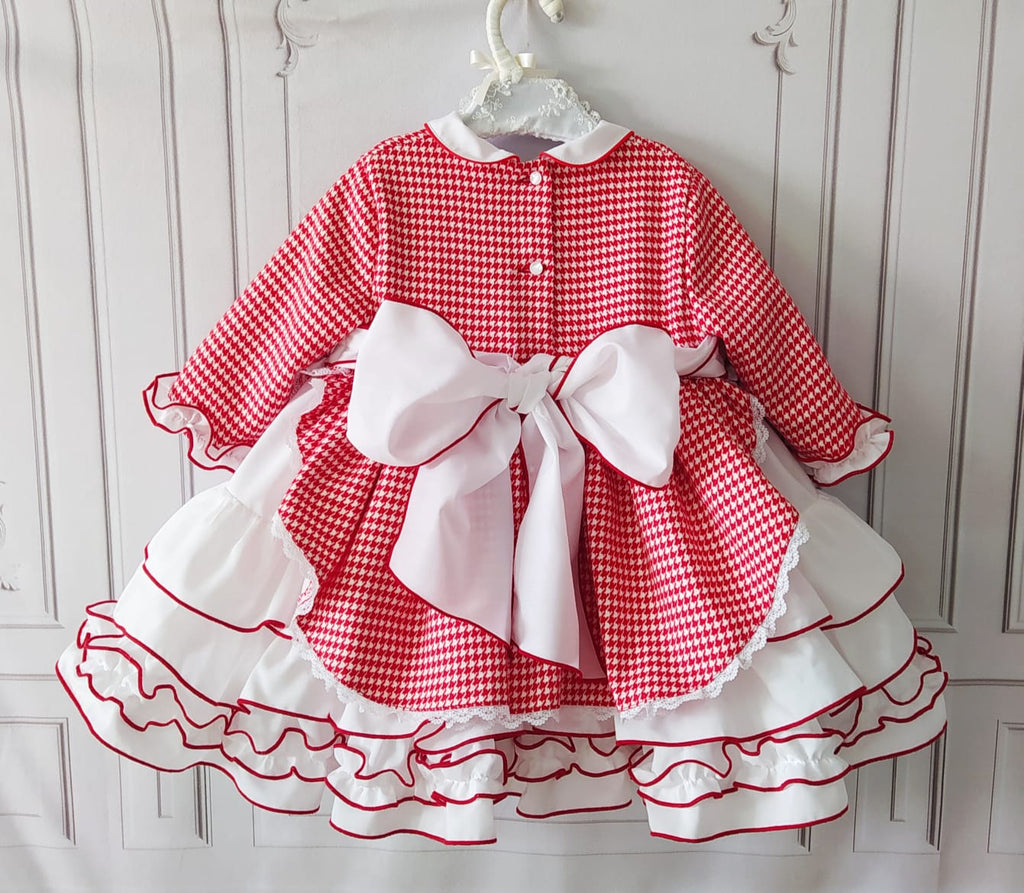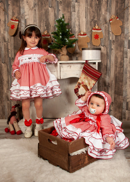 Sonata Infantil Spanish girls red smocked candy cane Christmas dress. True to size fitting. The matching bonnet is available to order separately. This item is made to order and takes approximately 8 weeks to arrive from the order date (if you need the item sooner please message us to discuss this)