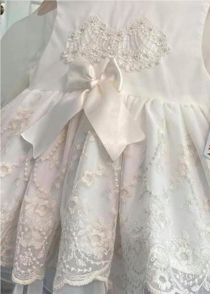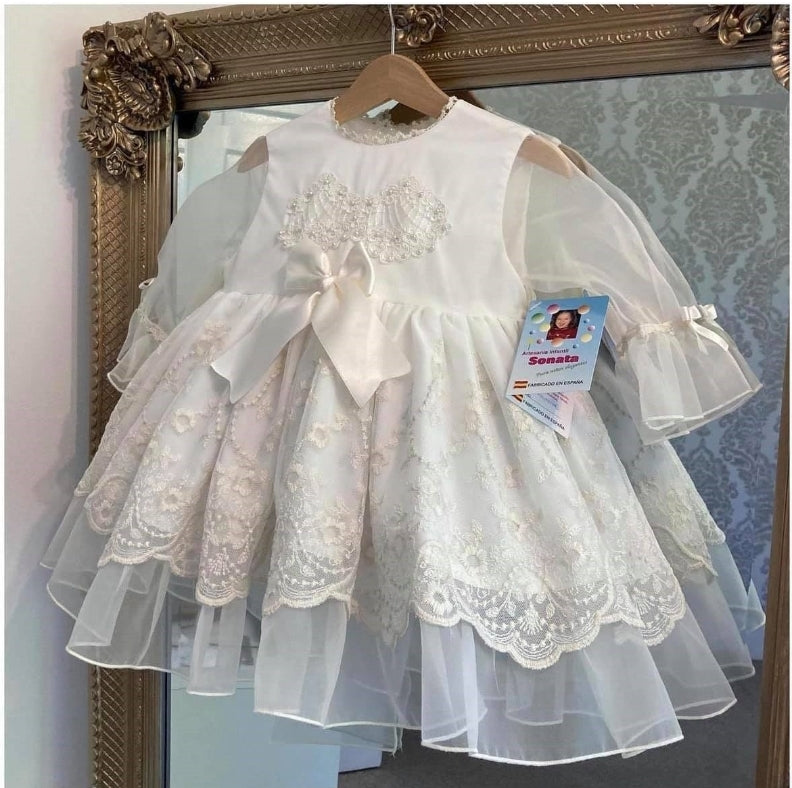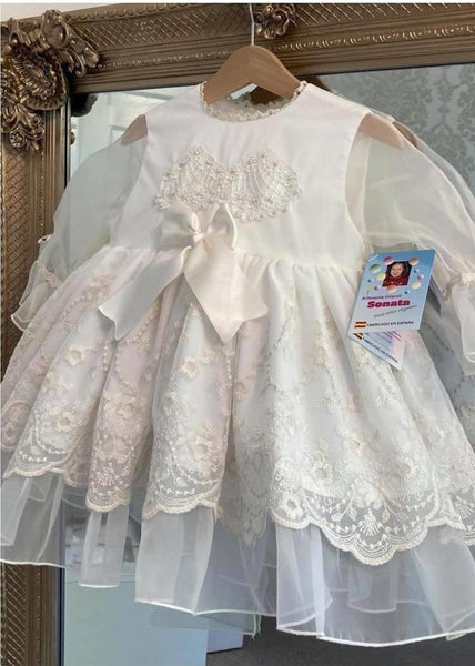 Sonata Infantil Spanish girls cream organza and lace puffball dress with satin bows and hand stitched beading to the chest. Perfect for Christenings, weddings and any special occasion. True to size fitting. These items are made to order and take approximately 8 weeks to arrive from the order date. Kindly note items which are 'made to order' are exempt from a return as they are ordered in by customer request. If you need measurements, please contact us before ordering.