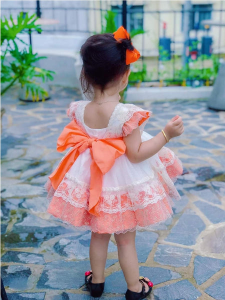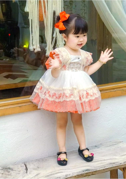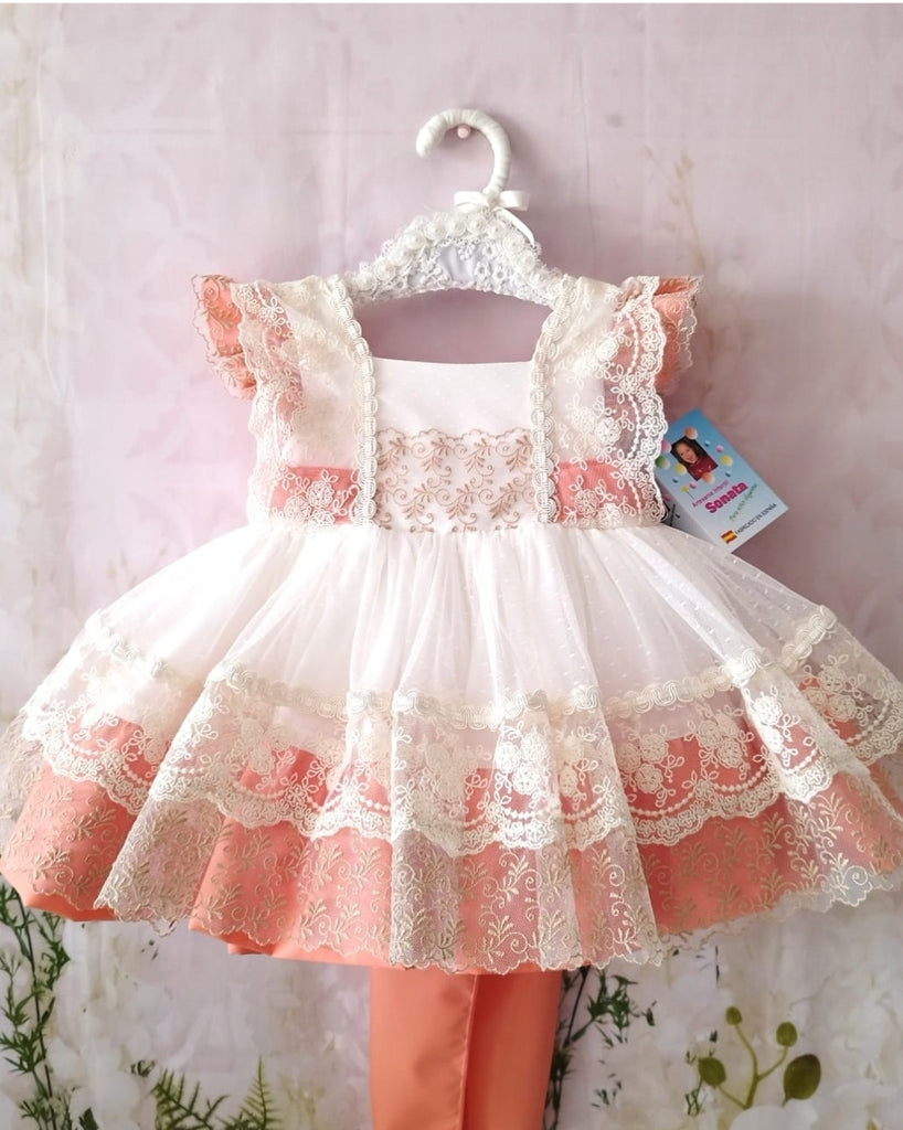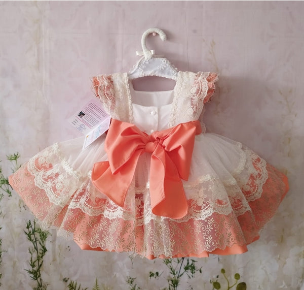 Sonata Infantil Spanish girls coral and cream puffball dress with lace embroidery and tulle trim. True to size fitting. Matching bow socks are available to order here. These dresses are made to order and take approximately 8 weeks to arrive from the order date. Kindly note items which are 'Made to order' are exempt from a return, as they are ordered in by customer request. If you need measurements, please send us a message before ordering.