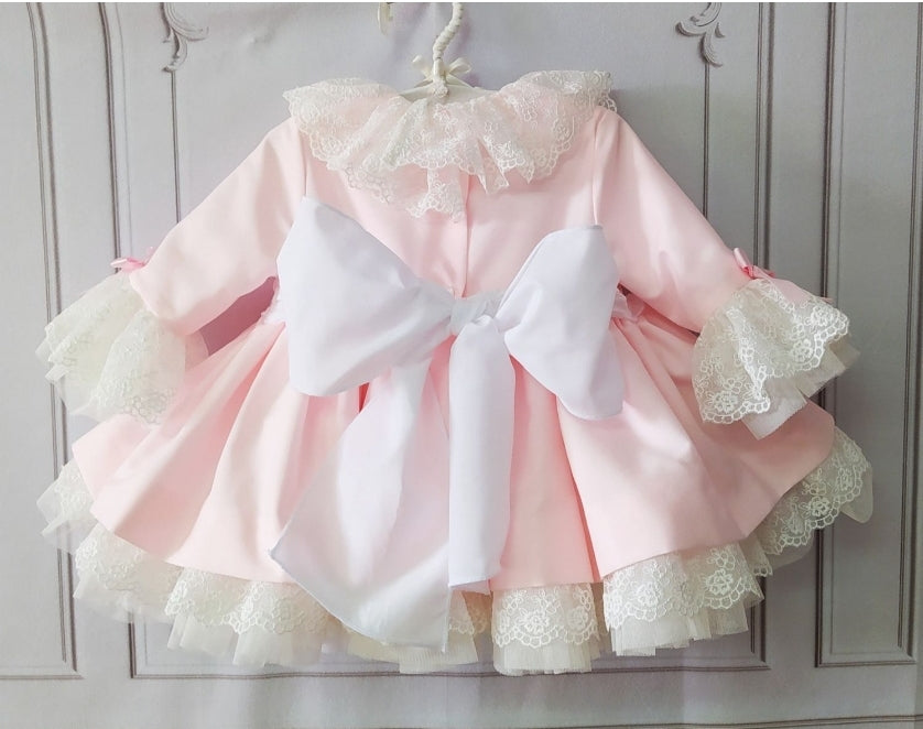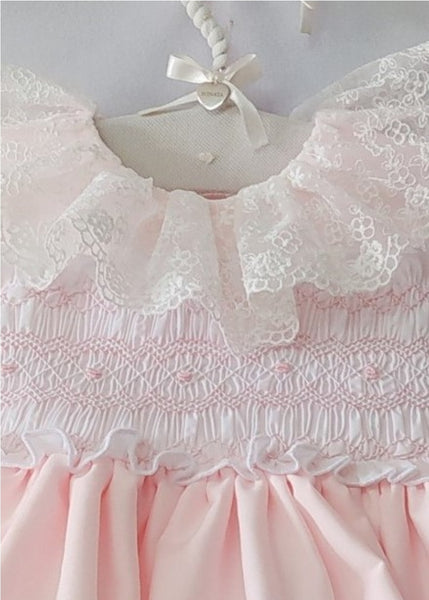 Sonata Infantil Spanish girls pink and white smocked dress with lace & bows. True to size fitting. This product is made to order and will take approximately 6 weeks to arrive from the order date. Kindly note items which are 'Made to order' are exempt from a return, as they are ordered in by customer request only.