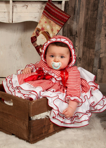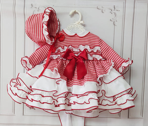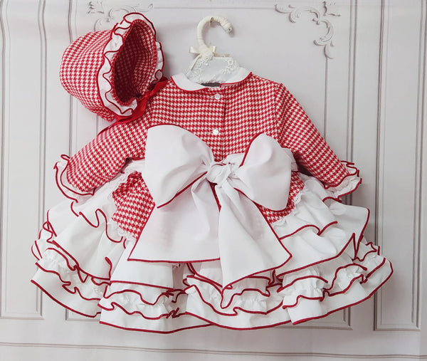 Sonata Infantil Spanish girls red Clemence puffball dress. True to size fitting. The matching bonnet is available to order separately. This item is made to order and takes approximately 8 weeks to arrive from the order date (if you need the item sooner please message us to discuss this)