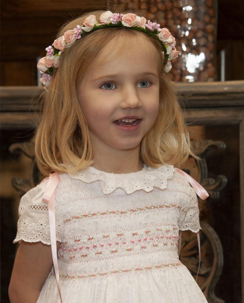 Sonata traditional girls white and pink cotton dress with a double smocked panel to the chest. Optional bonnet is available to match. True to size fitting. This product is made to order and will take approximately 8 weeks to arrive from the order date. Kindly note items which are 'Made to order' are exempt from a return, as they are ordered in by customer request. If you need measurements before ordering, please send us a message via email, or contact us on Facebook My Fair Baby Boutique - Home | Facebook or Instagram @my_fair_baby_boutique
