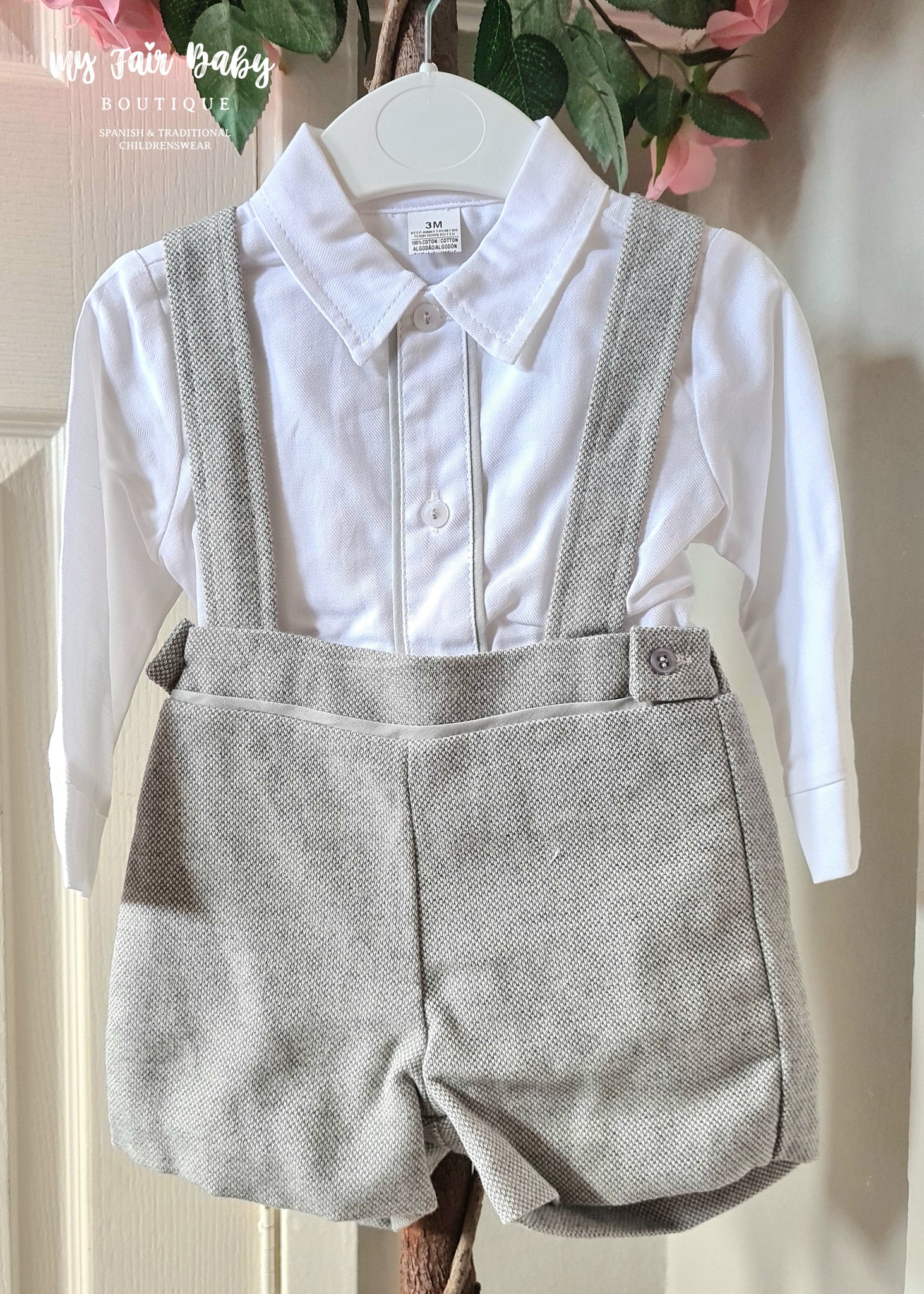 Spanish baby boys grey dungarees. Matched with a white cotton shirt with grey trim. True to size fitting. Also available in navy.
