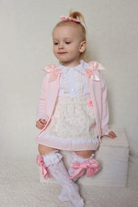 Spanish baby girls pink and cream floral skirt with satin bow detailing. Complete with a coordinating blouse. Matching cardigan is available here.