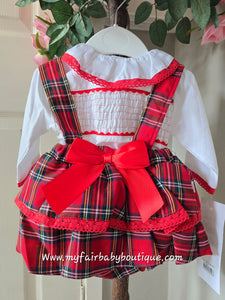 Spanish baby girls red tartan frilly skirt with a front bow. Matched with a white long sleeved cotton blouse with smocking to the chest.