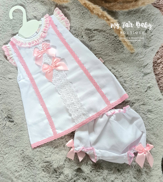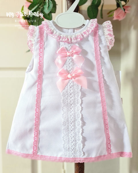 Spanish baby girls white waffle dress. Featuring front lace and bow detailing and reverse button fastening. Complete with matching pants. True to size fitting.
