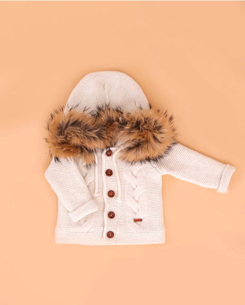 Spanish Chunky Knitted Cream Baby Coat/Jacket With Fur Hood - 9-18m