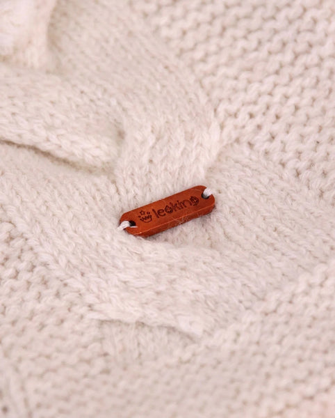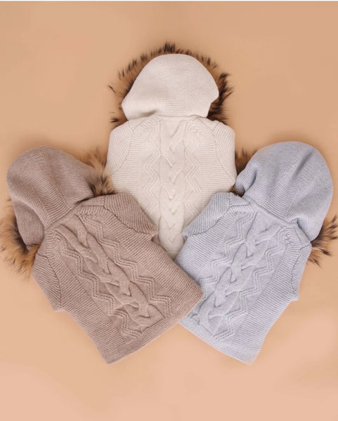 Spanish baby boys chunky knitted Merino wool jacket. Features a double knitted cable design, soft fleece lining for warmth, a hood with detachable fur trim and front button fastening.