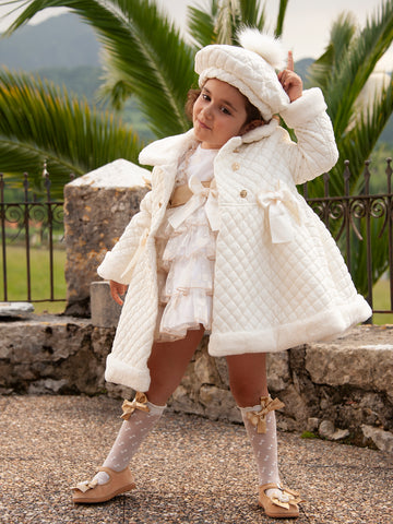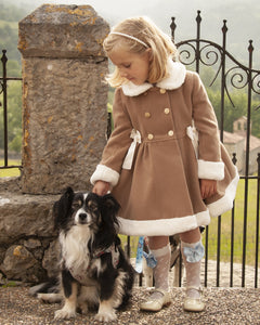 This item is made to order and takes approximately 8 weeks to arrive from the order date. Beautiful Spanish luxury girls camel dress coat with cream fur trim and front and back bow detailing.