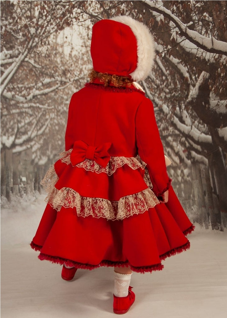 Sonata Infantil Spanish girls red Lisette Winter Coat. Features beautiful lace and fur trim, back ruffles, bow detailing to the front and reverse and gold button fastening. The matching hat and dress are available to order separately. This item is made to order and takes approximately 6-8 weeks to arrive from the order date.