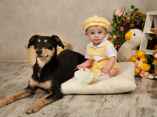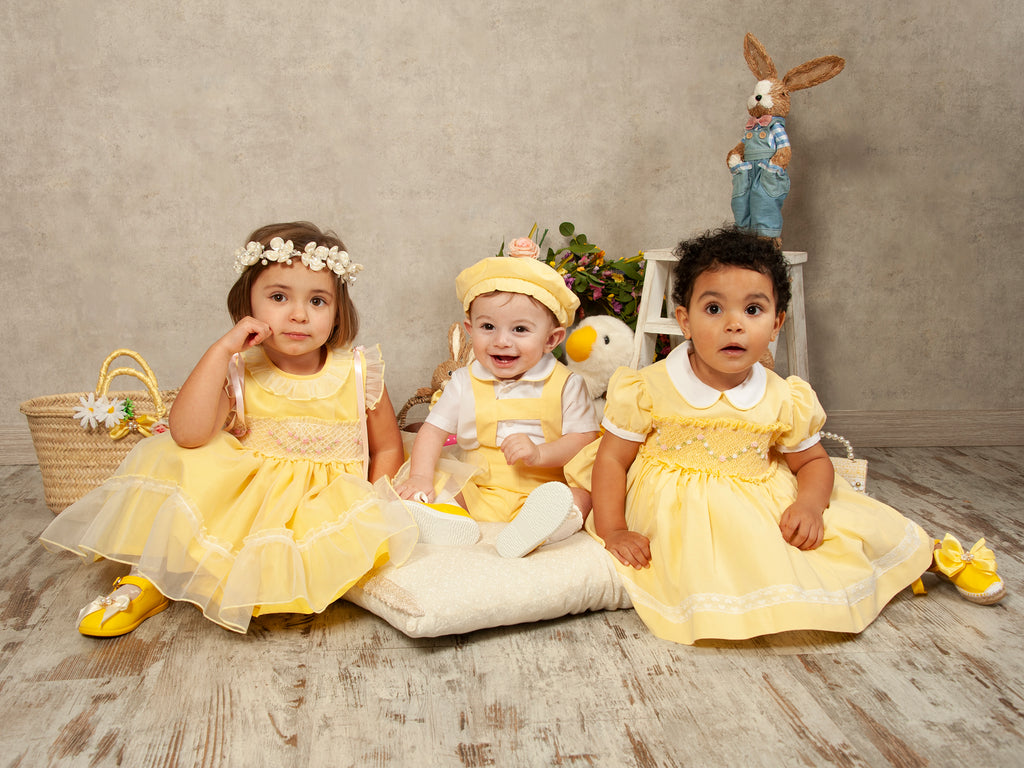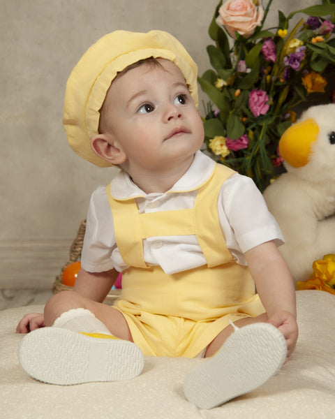 Sonata Infantil Spanish baby boys lemon h-bar dungarees, matched with a white short sleeved shirt. Matching hat is available to order seperately. Matching girls dresses are available separately. This product is made to order and takes approximately 6 weeks to arrive from the order date. Kindly note items which are 'made to order' are exempt from a return as they are ordered in by customer request. If you need measurements, please contact us before ordering.