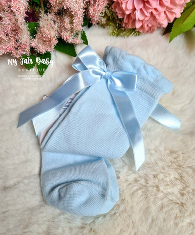 Spanish style baby girls petrol blue knee high socks with a large satin side bow. Other colours are available.