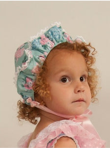 Sonata Infantil Spanish girls blue & pink floral puffball dress with lace trim. True to size fitting. Optional bonnet available. Matching shoes available separately. These items are made to order and take approximately 8 weeks to arrive from the order date. Kindly note items which are 'made to order' are exempt from a return as they are ordered in by customer request.
