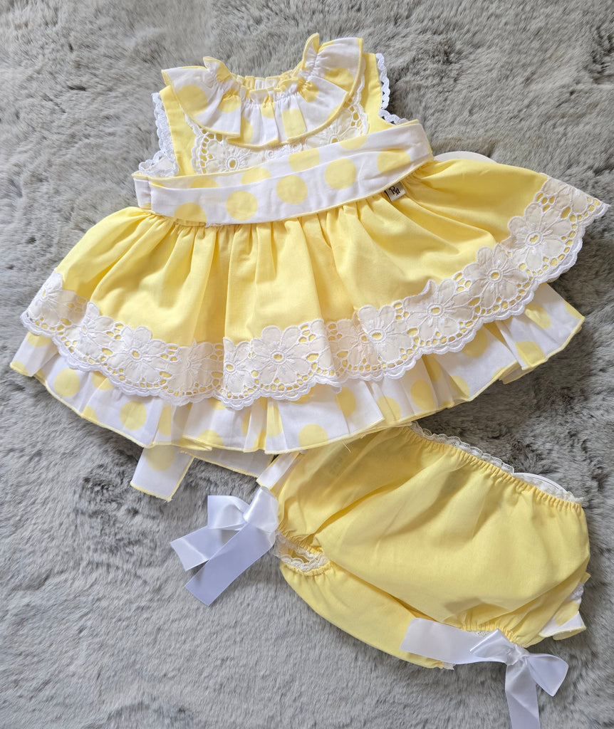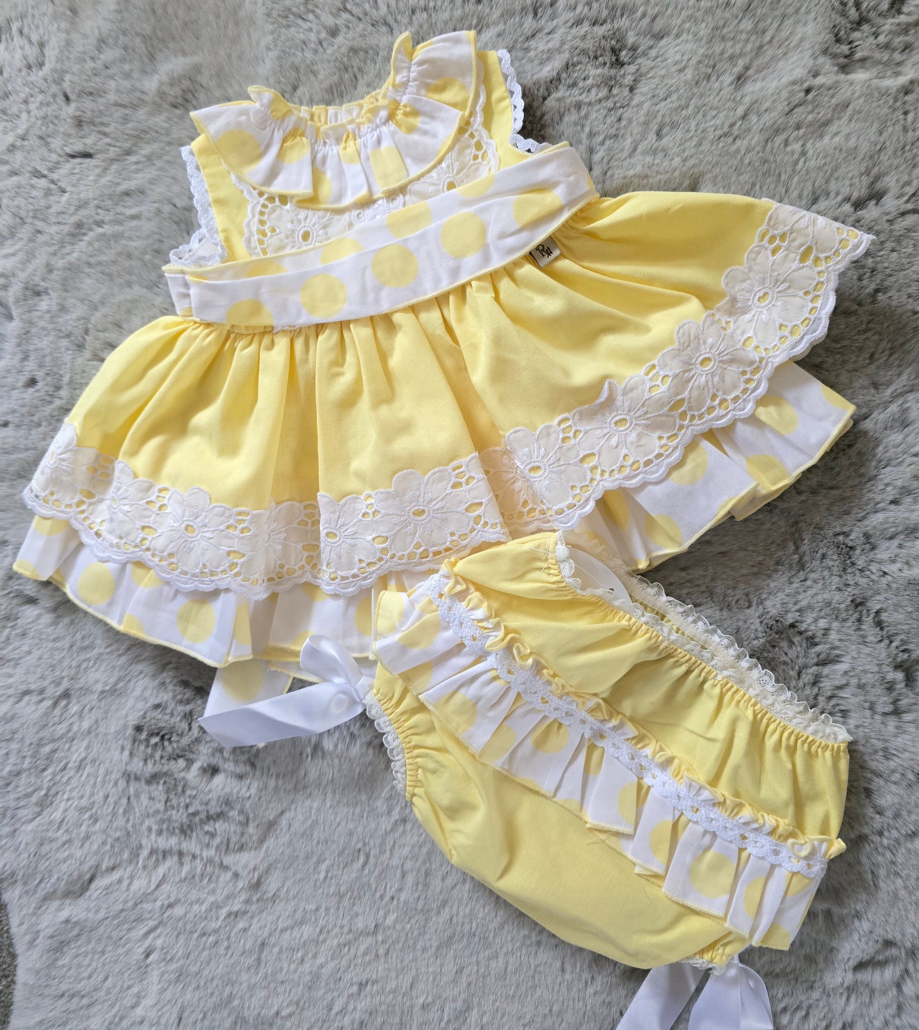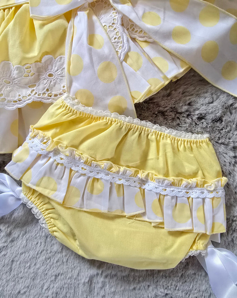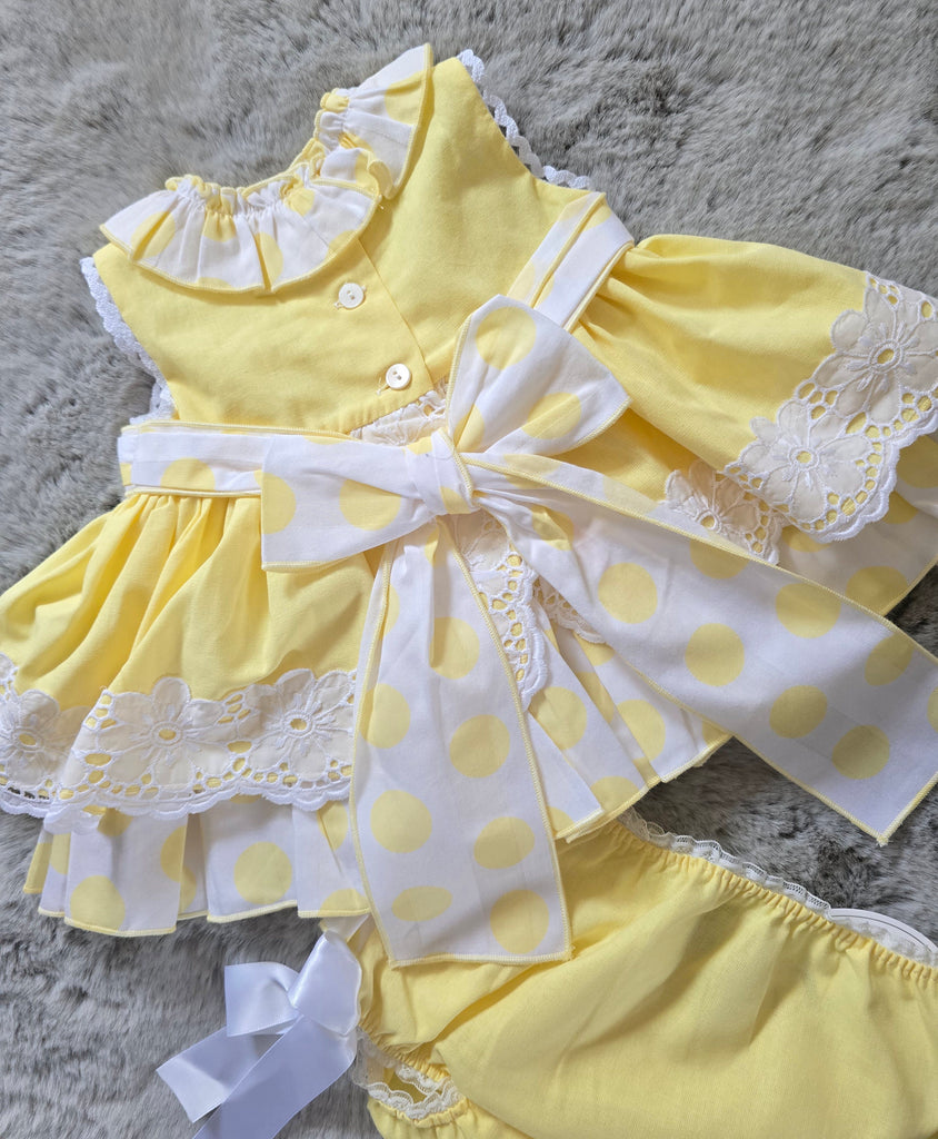 Spanish baby girls lemon and white dress with lace trim and a finished with a large back bow. Complete with matching frilly bow pants by Ricittos.