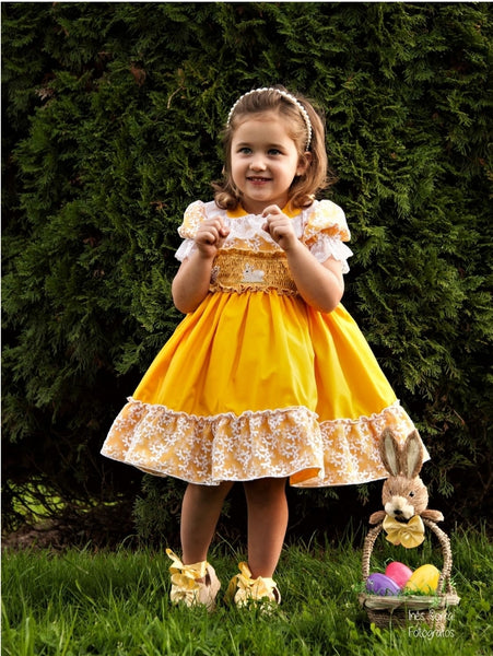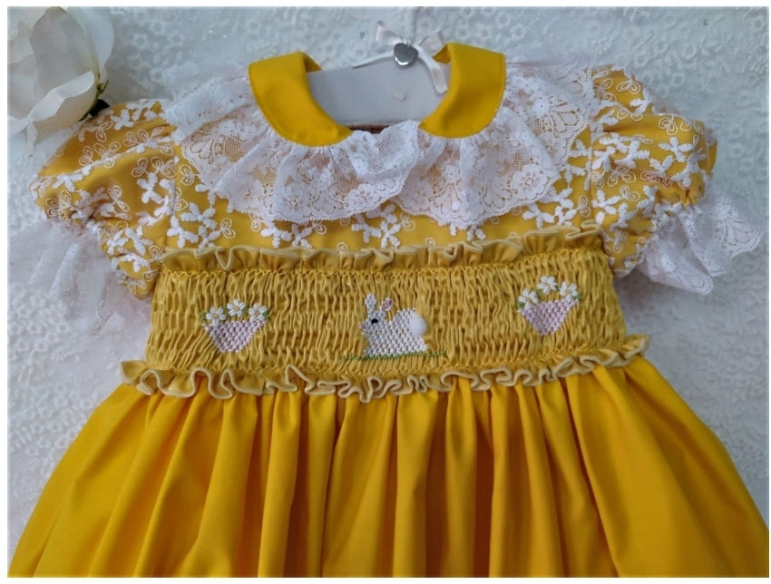 Sonata Infantil Spanish Girls Lemon Smocked Easter Bunny Dress VE2118 - MADE TO ORDER