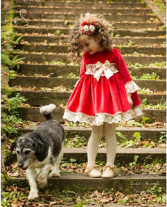 Sonata Infantil Spanish baby girls red velvet puffball dress in 12m. Fully layered for fullness and trimmed with delicate lace. True to size fitting. The bonnet is not included. This dress is reduced to clear and is non returnable.