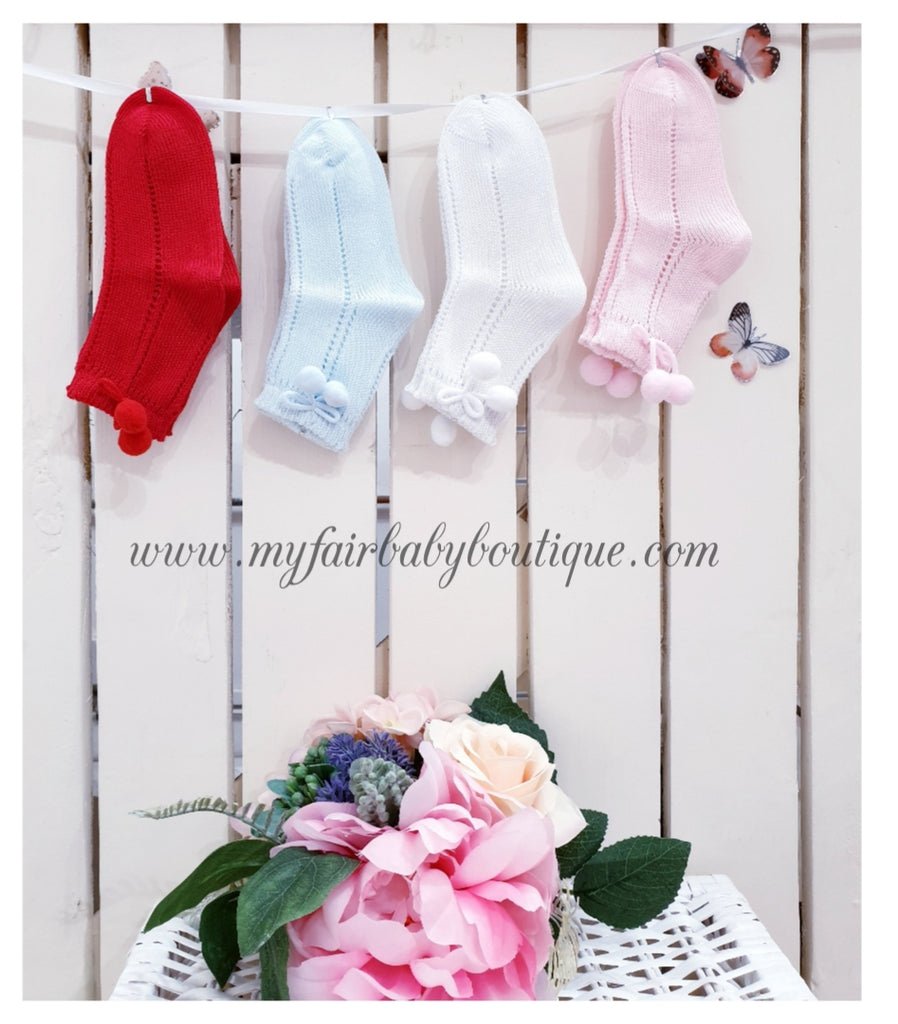 Spanish girls and boys ankle socks with side pom pom detailing. Please take care with the pom poms and do not leave young children unaccompanied with them. Wash inside out.