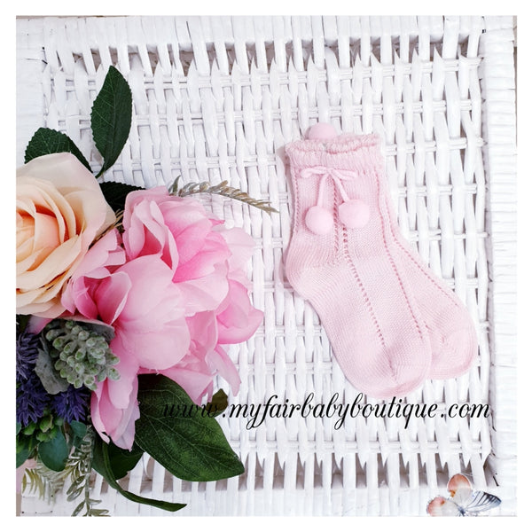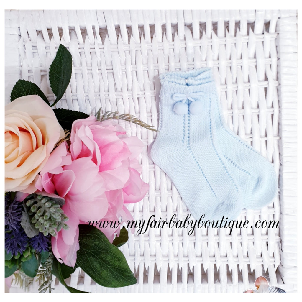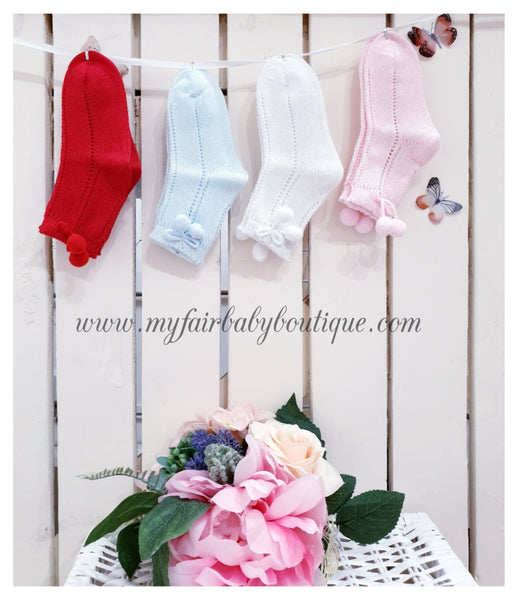 Spanish Ankle High Pom Pom Socks - Blue or Pink - Size 9-11