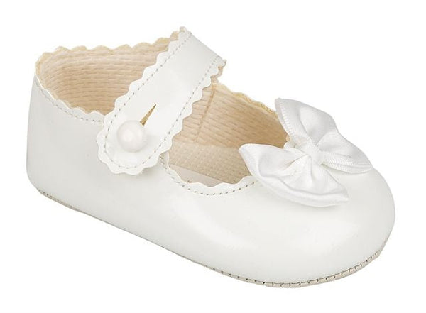 Baypod traditional baby girls white patent soft soled pram shoes. Featuring gripper soles, button fastening and cute bow detailing.