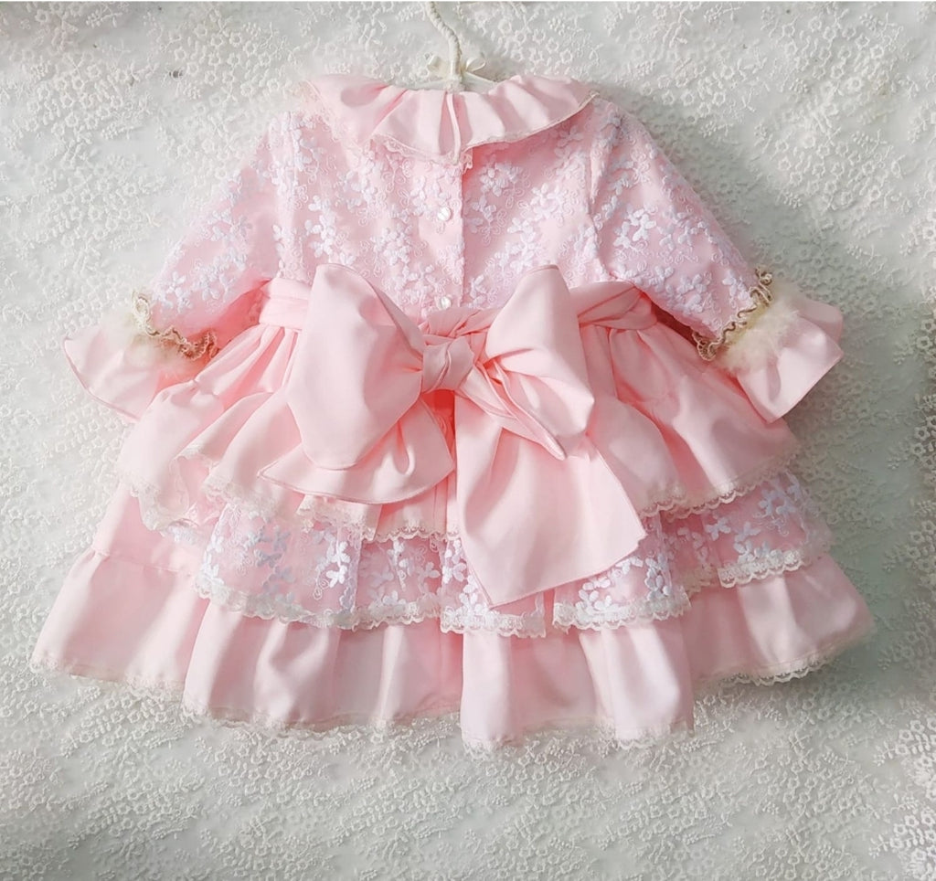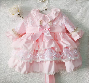 Sonata Infantil Spanish girls pink ruffles Sole puffball dress with embroidery and fur trim. True to size fitting. the matching bonnet, socks and coat are all available to order separately. This item is made to order and takes approximately 8 weeks to arrive from the order date (if you need the item sooner please message us to discuss this)