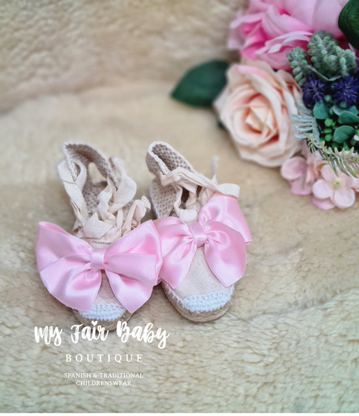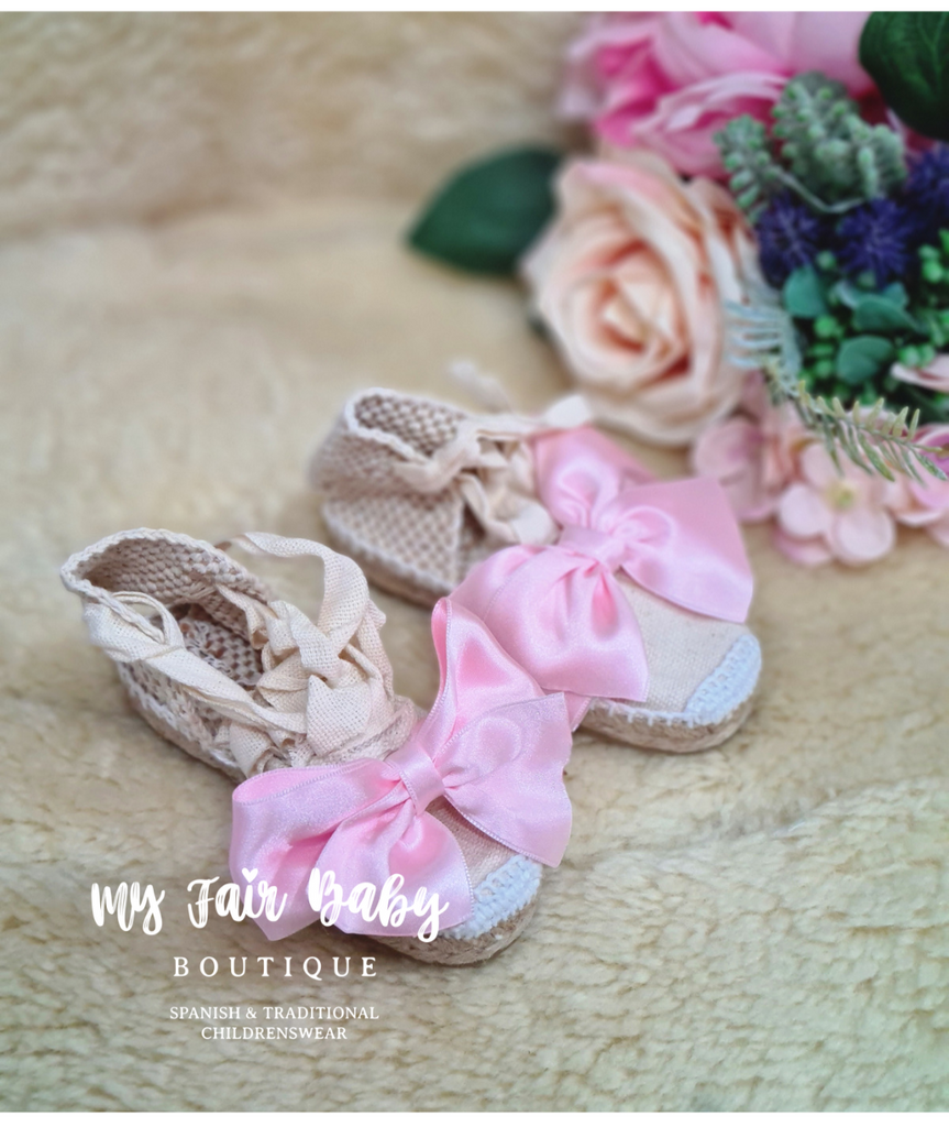 Sonata Infantil Spanish girls summer canvas shoes with large silk bows and ribbon fastening. Sizes 18-23 are flat soled without the wedge.